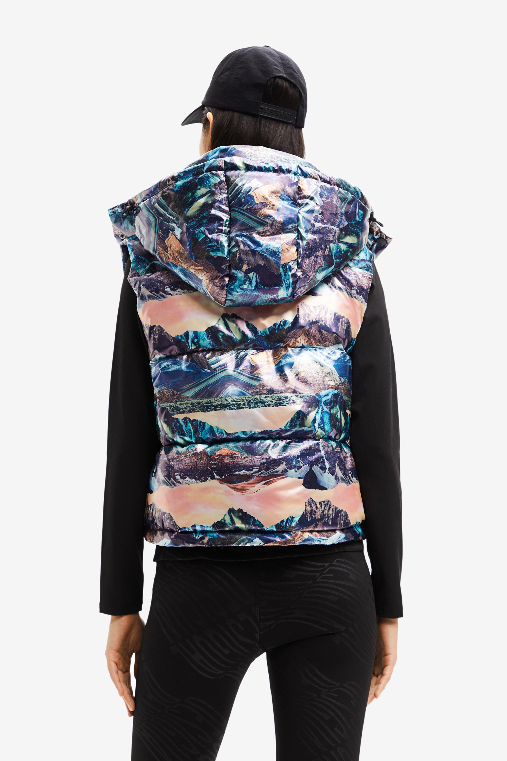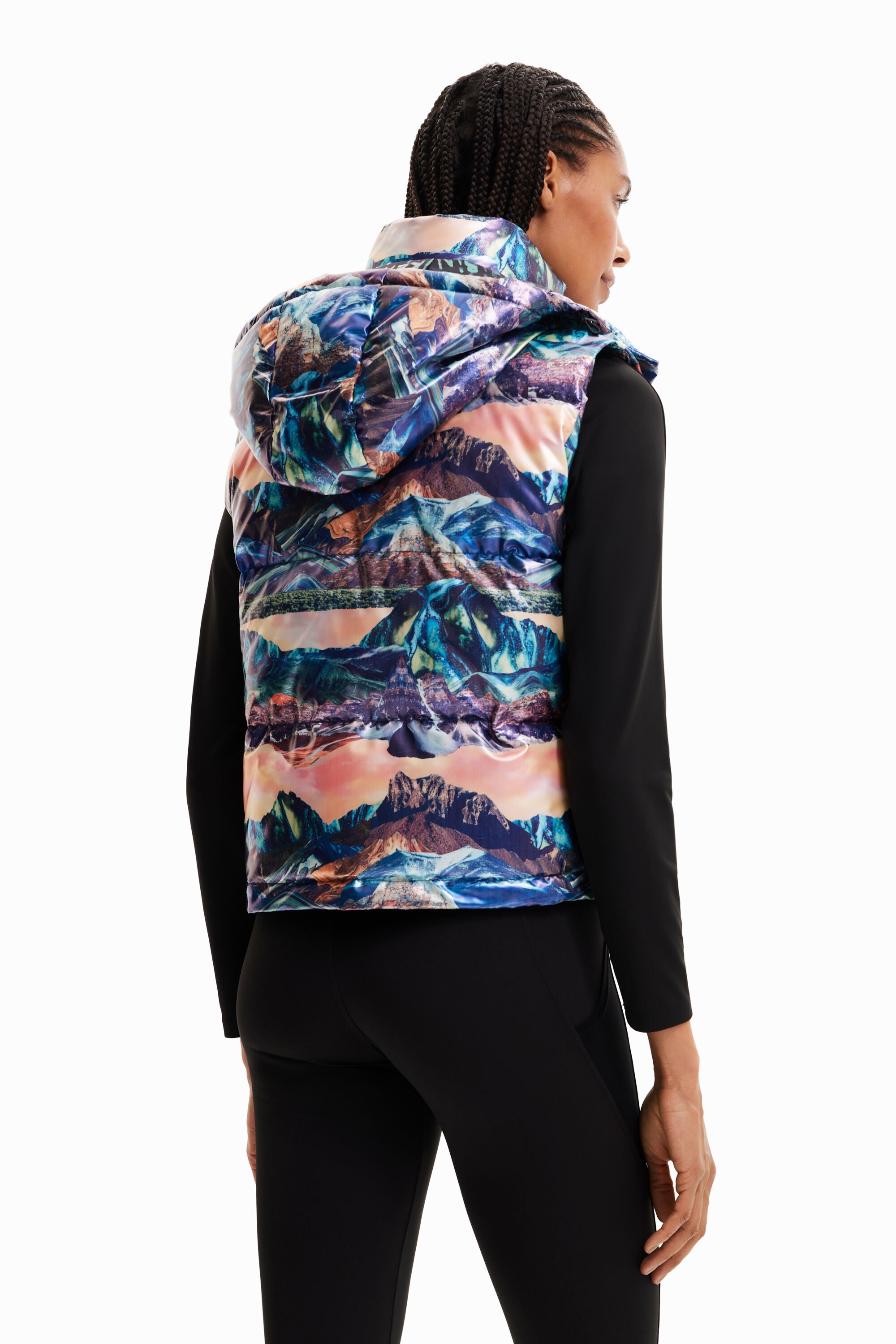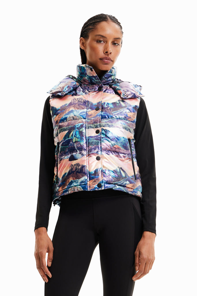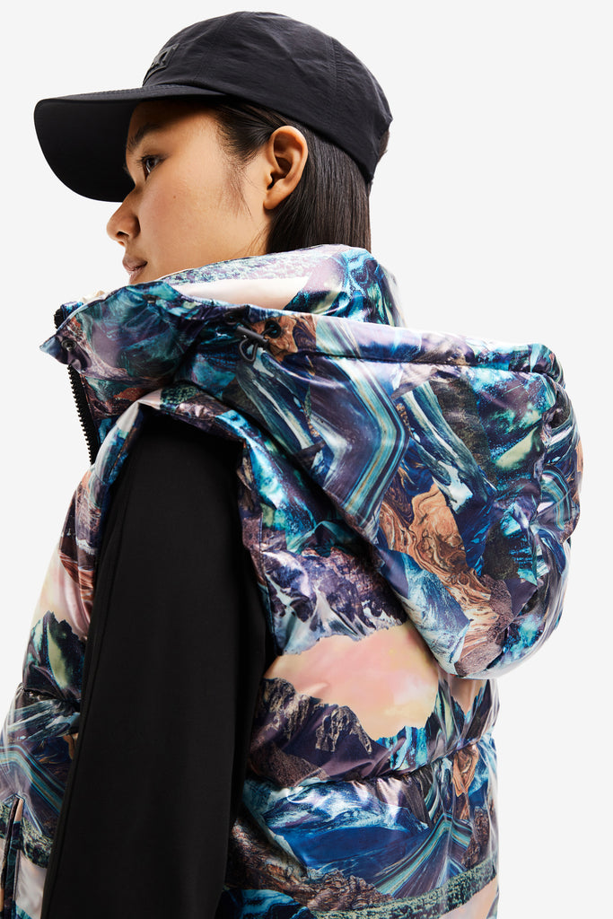 Short quilted gilet with a digital landscape print and iridescent effect. Made from recycled fibres with a hood and an adjustable drawstring waist.