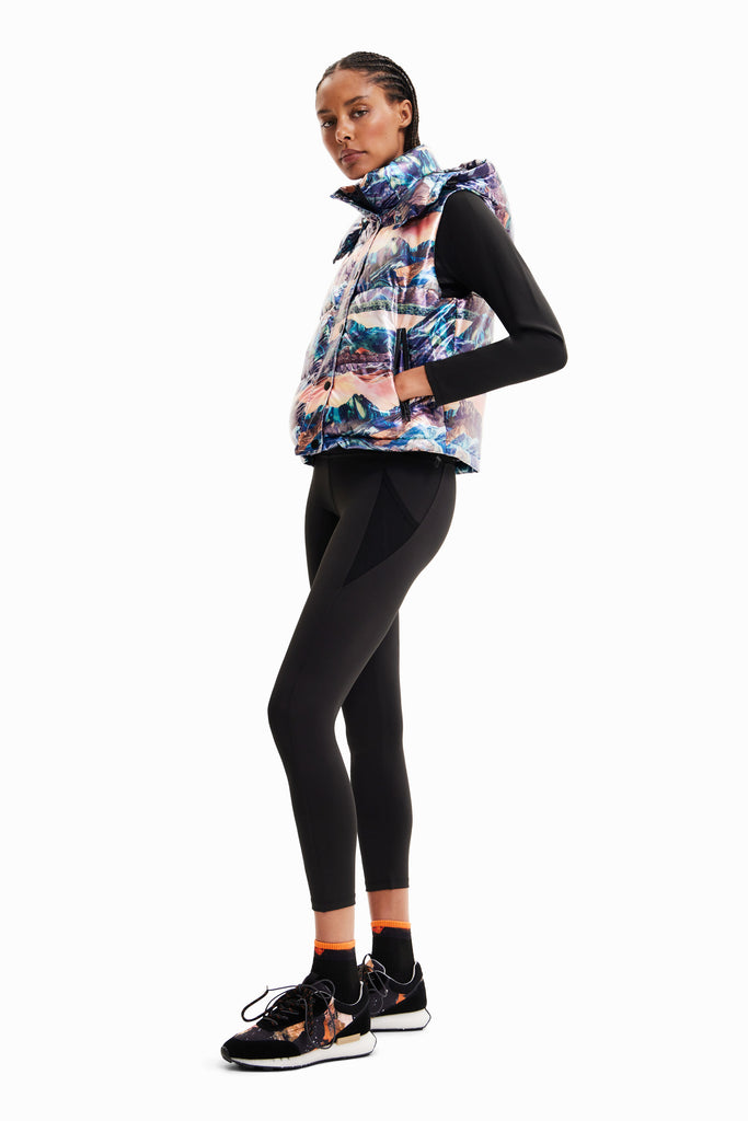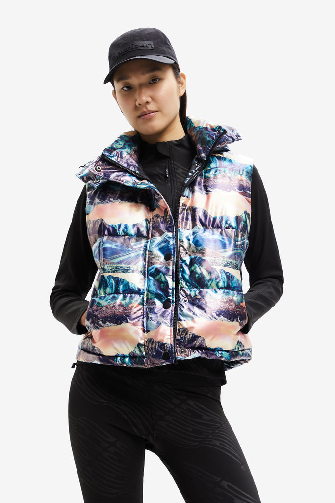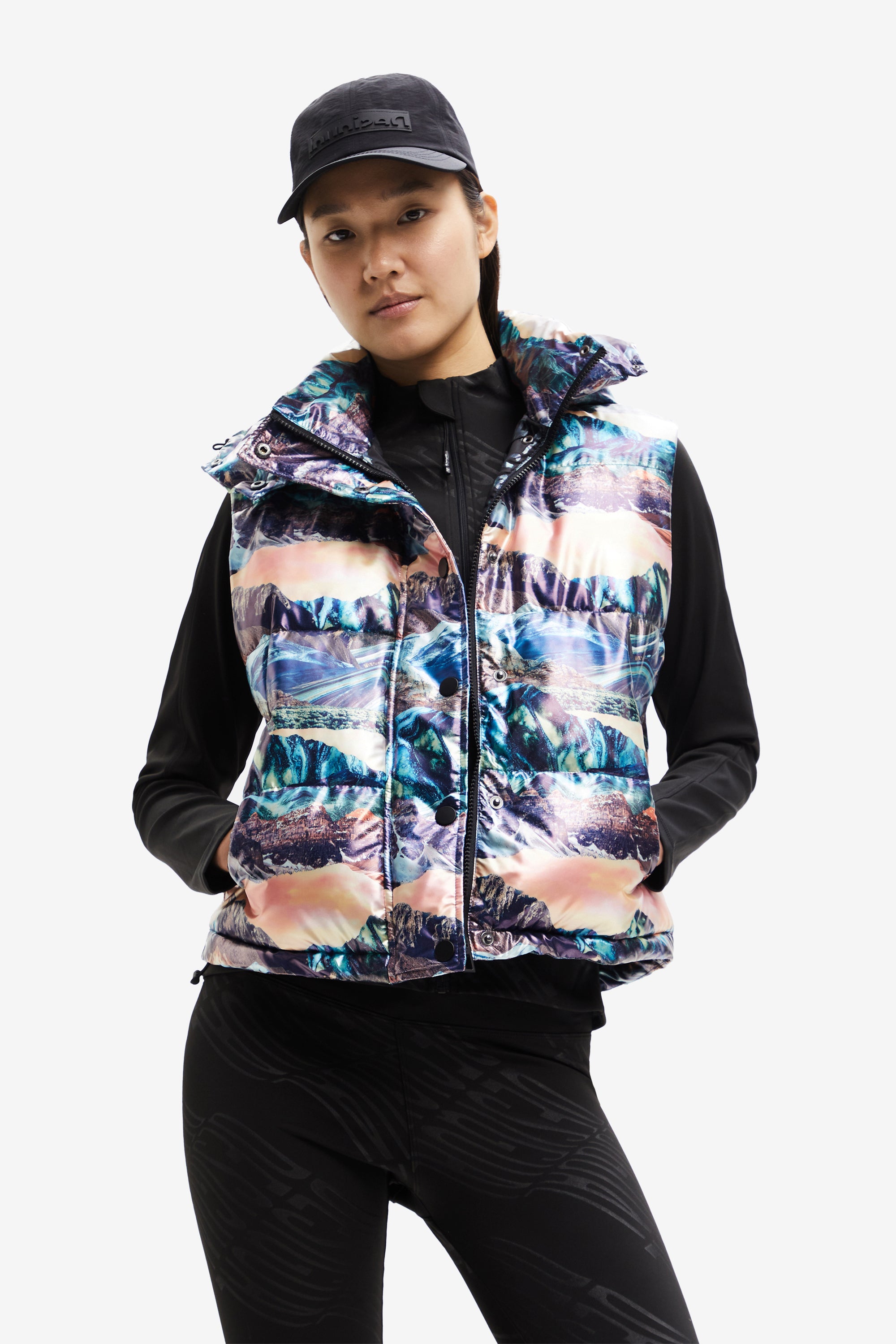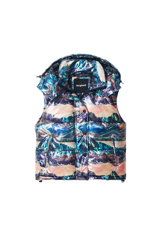 Short quilted gilet with a digital landscape print and iridescent effect. Made from recycled fibres with a hood and an adjustable drawstring waist.