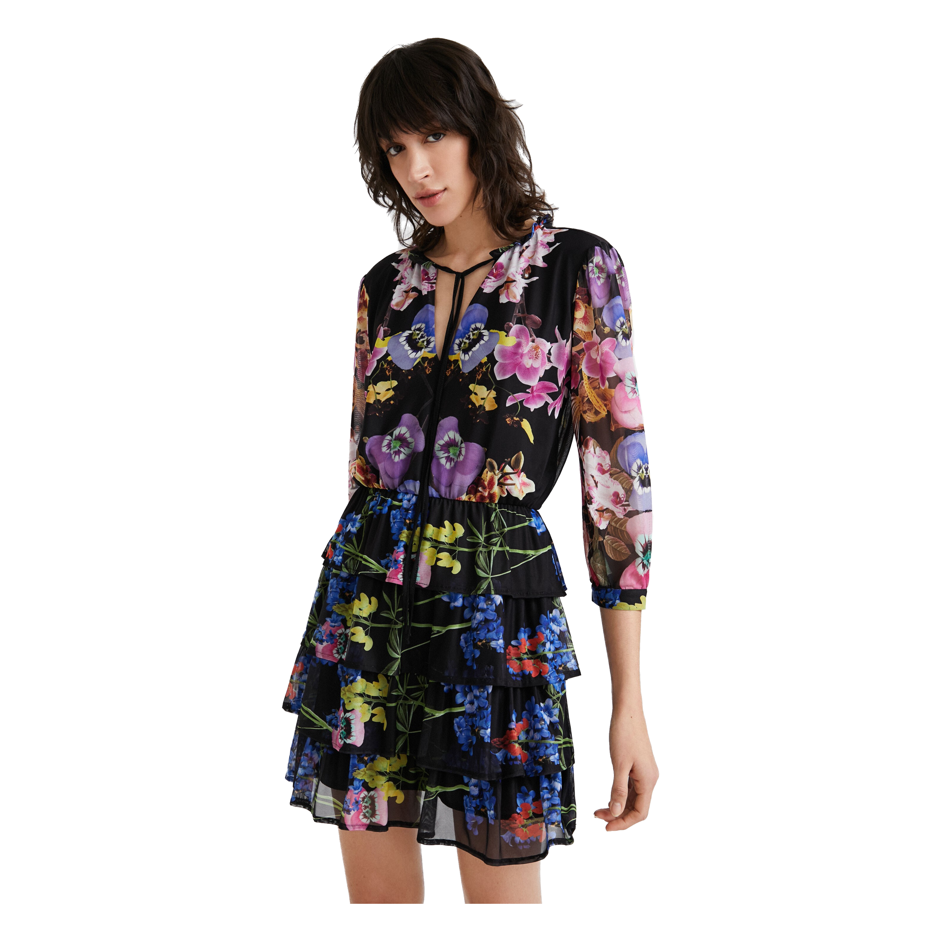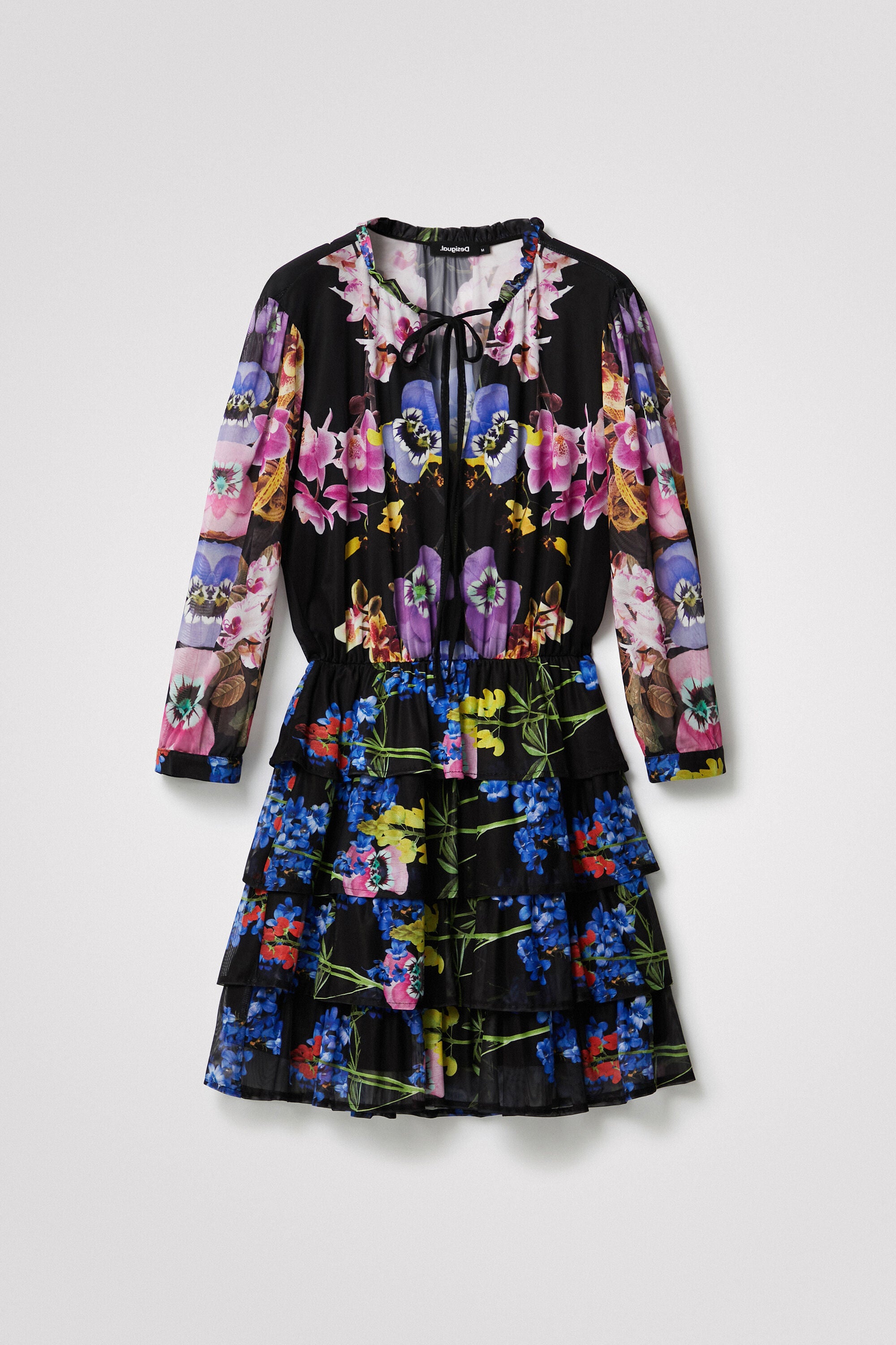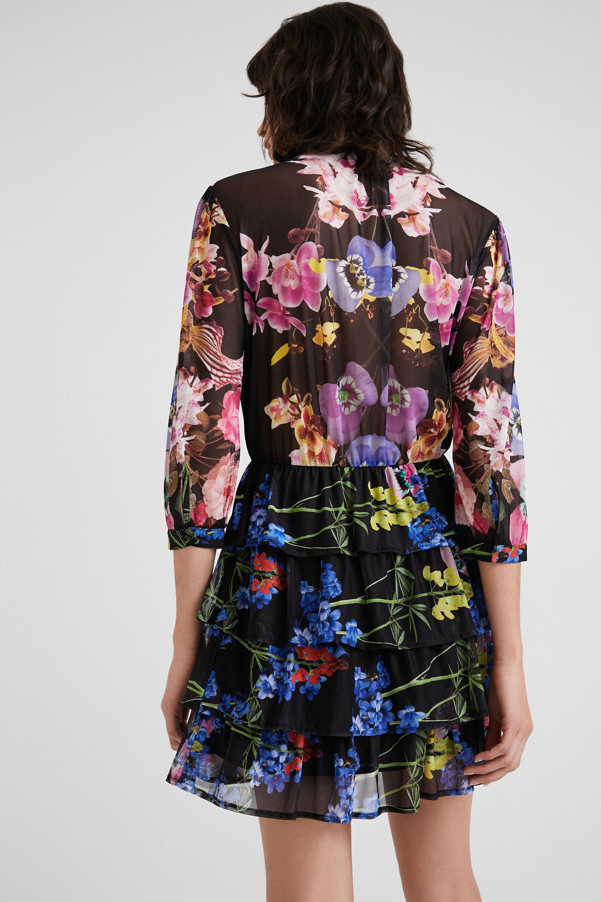 Eco-friendly viscose tulle and knit dress with an orchid print by M. Christian Lacroix. The sleeves are long and semi-transparent, and it features a layered skirt and a Mandarin collar with a cord.