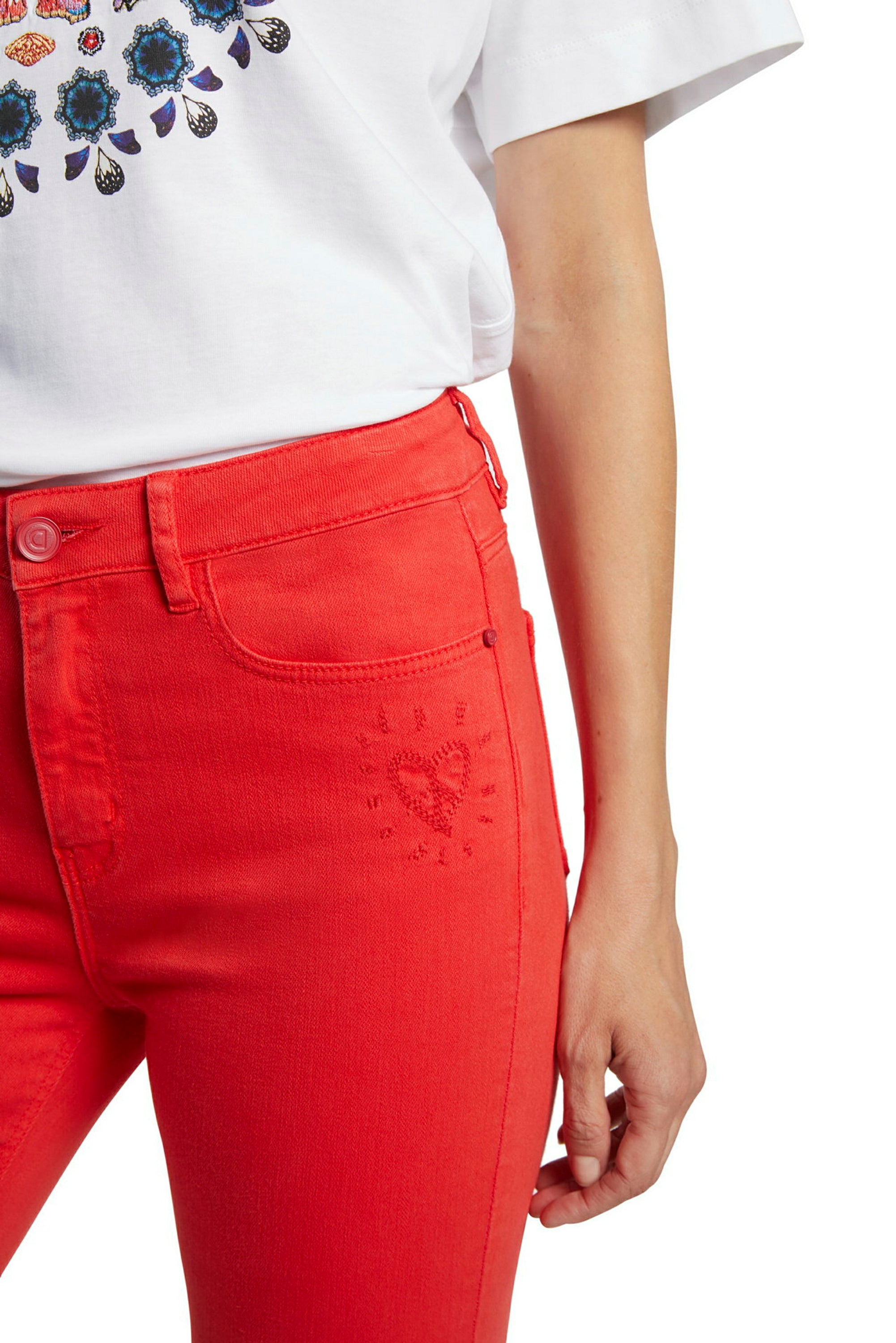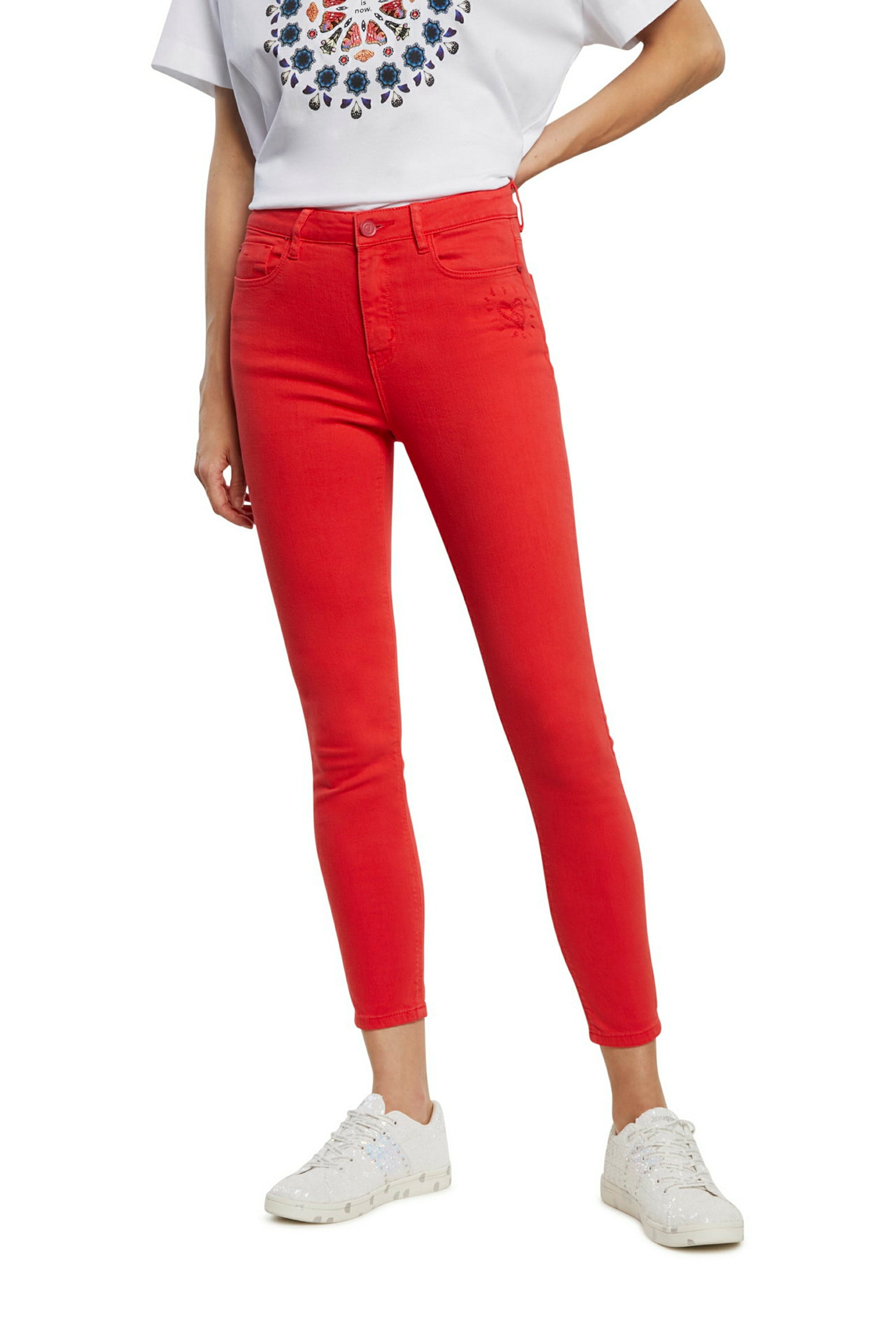 Wear your jeans in many more colours than the classic blue. Look, for example, at these flattering and comfortable skinny cropped trousers in flat colour with a small heart embroidered under the pocket.