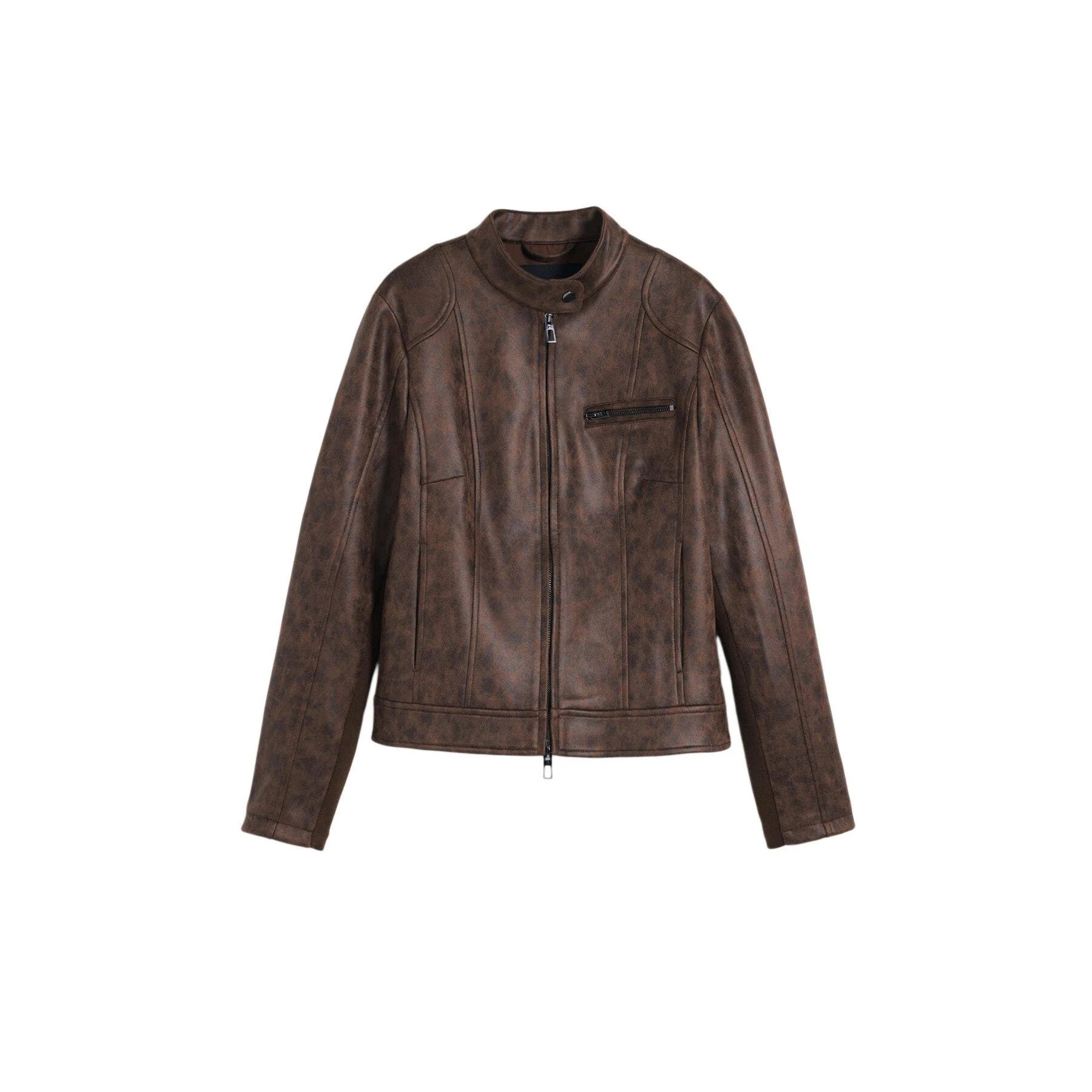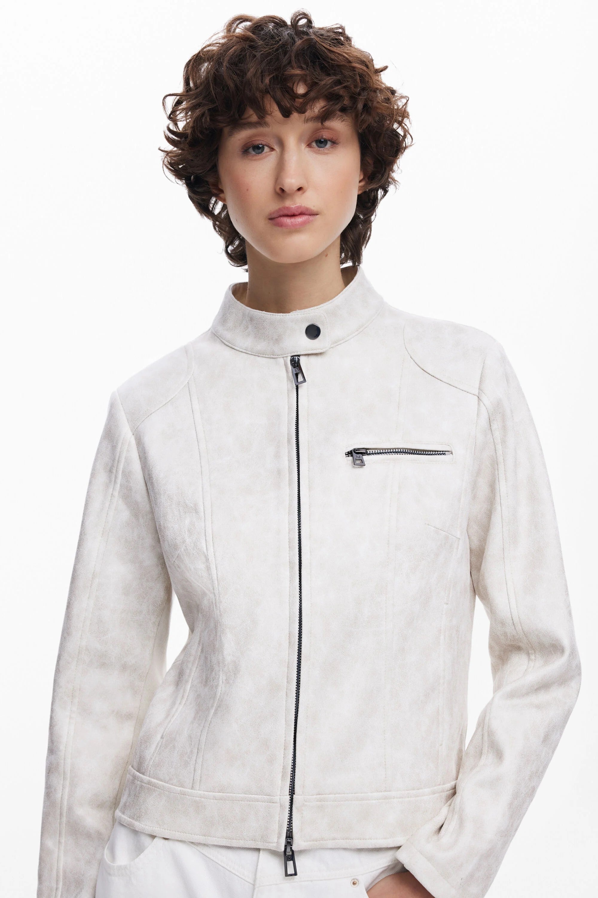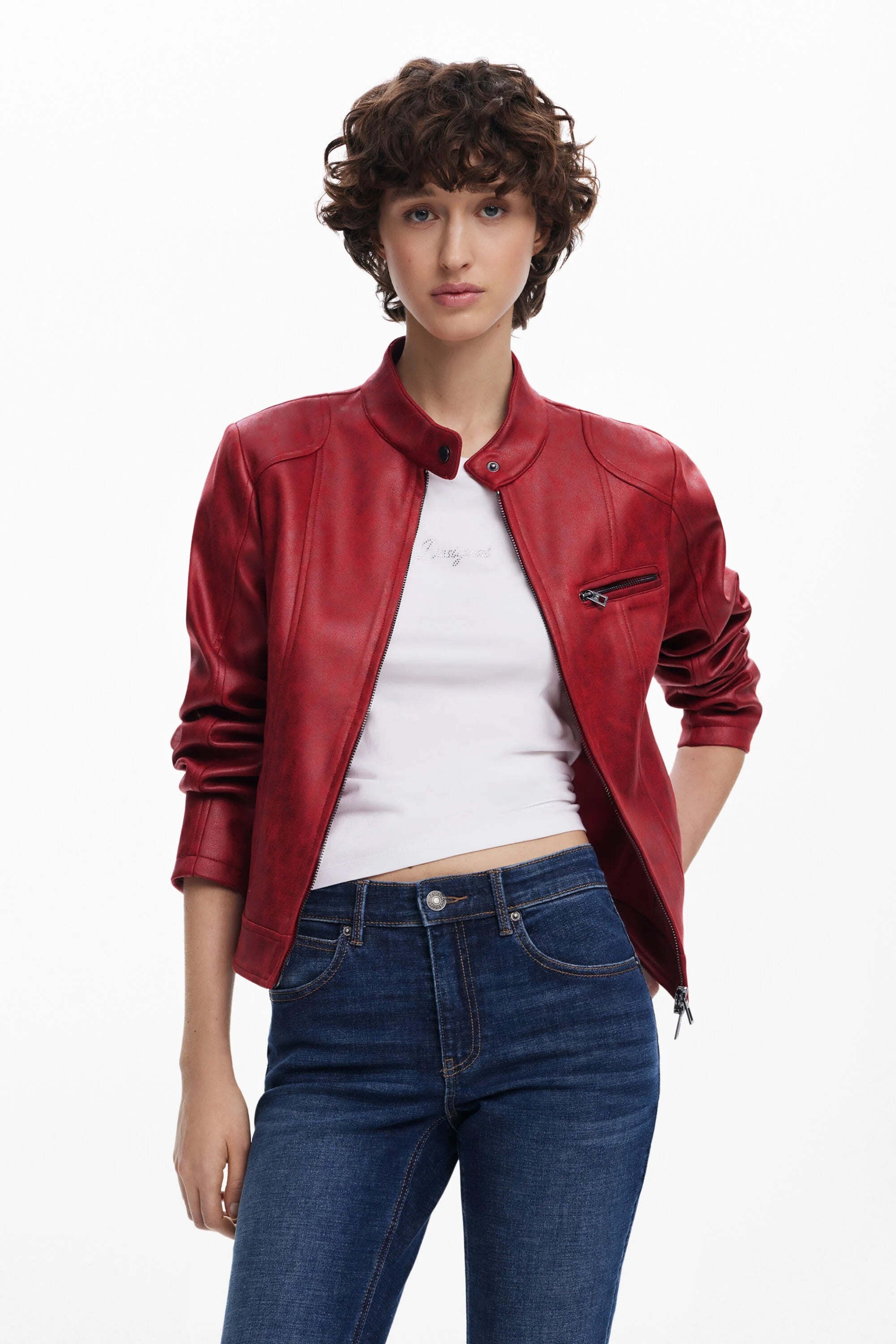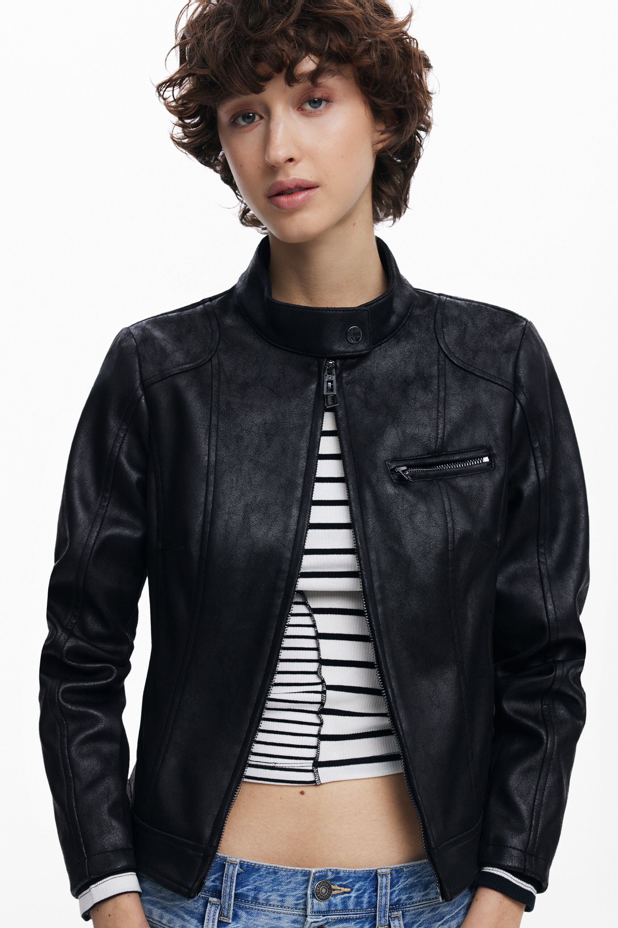 Jacket in worn leather effect, fitted, with mandarin collar, zipper closure, and front pockets.