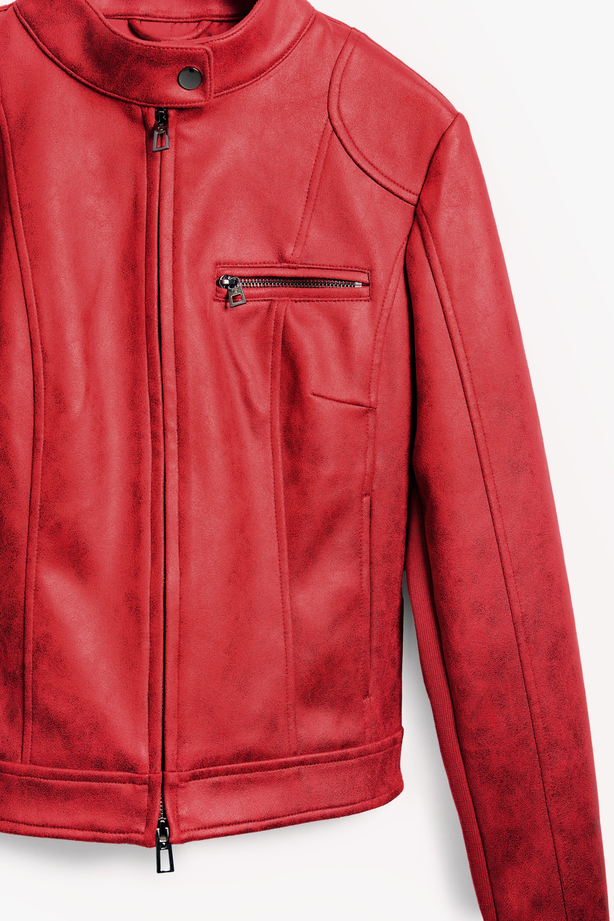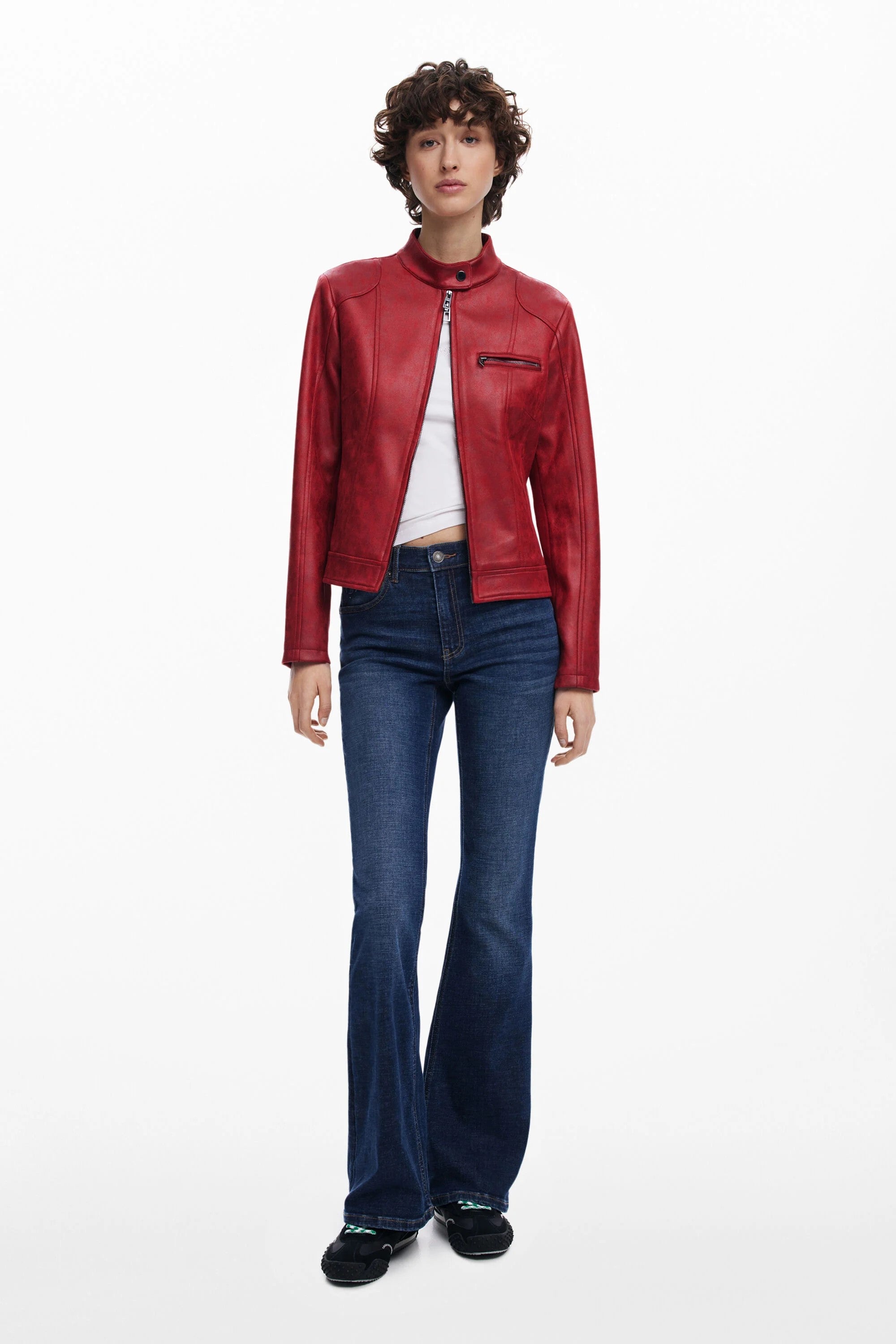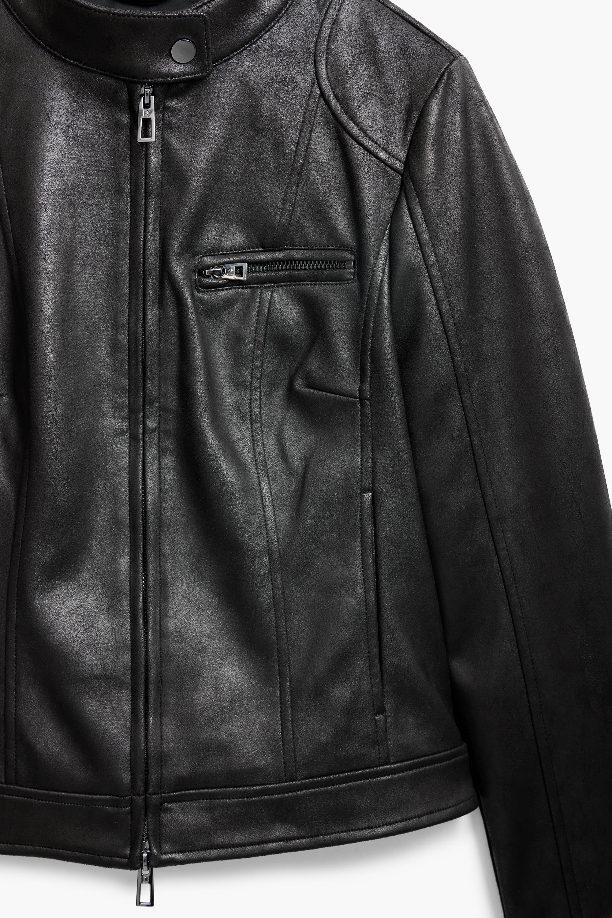 Jacket in worn leather effect, fitted, with mandarin collar, zipper closure, and front pockets.