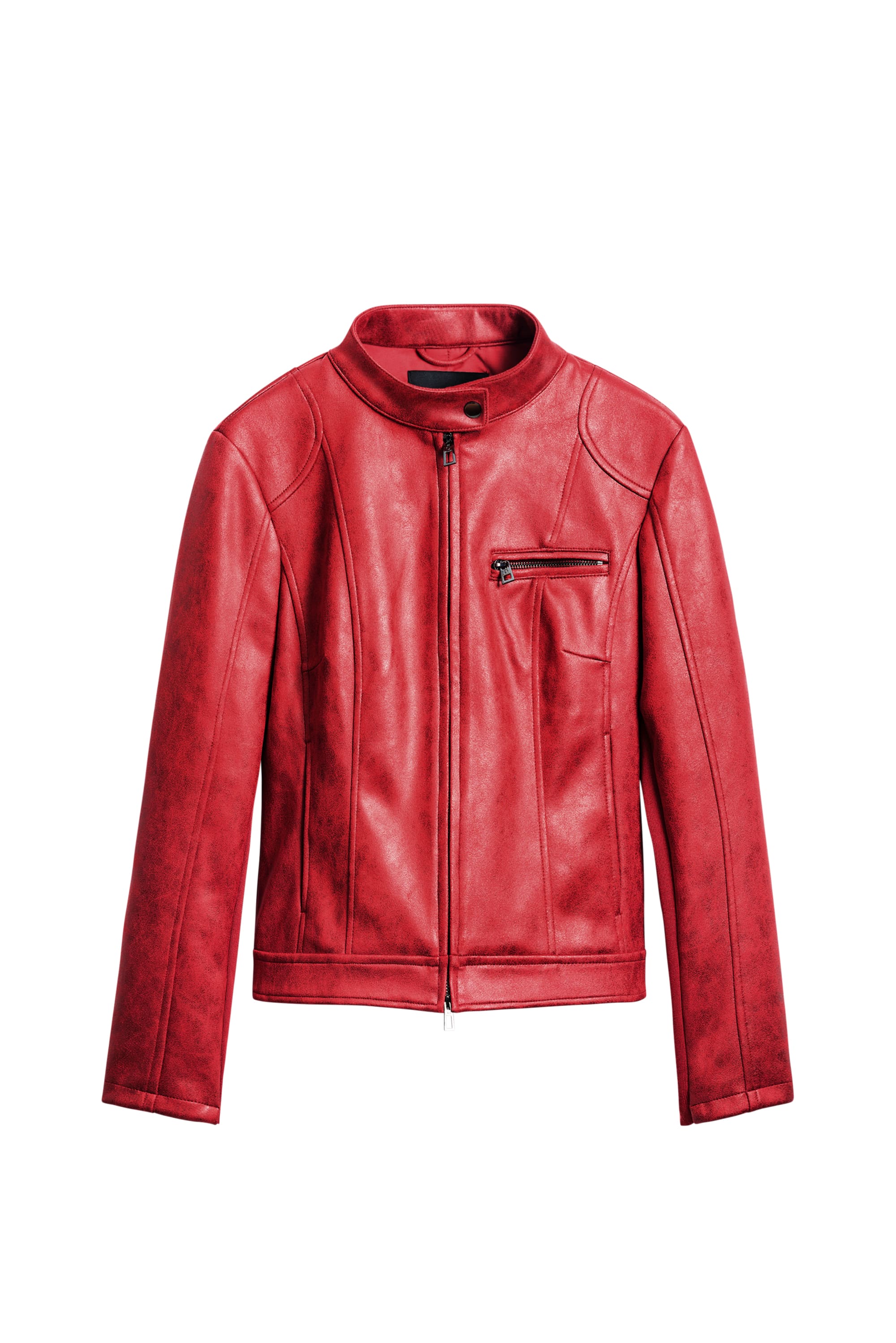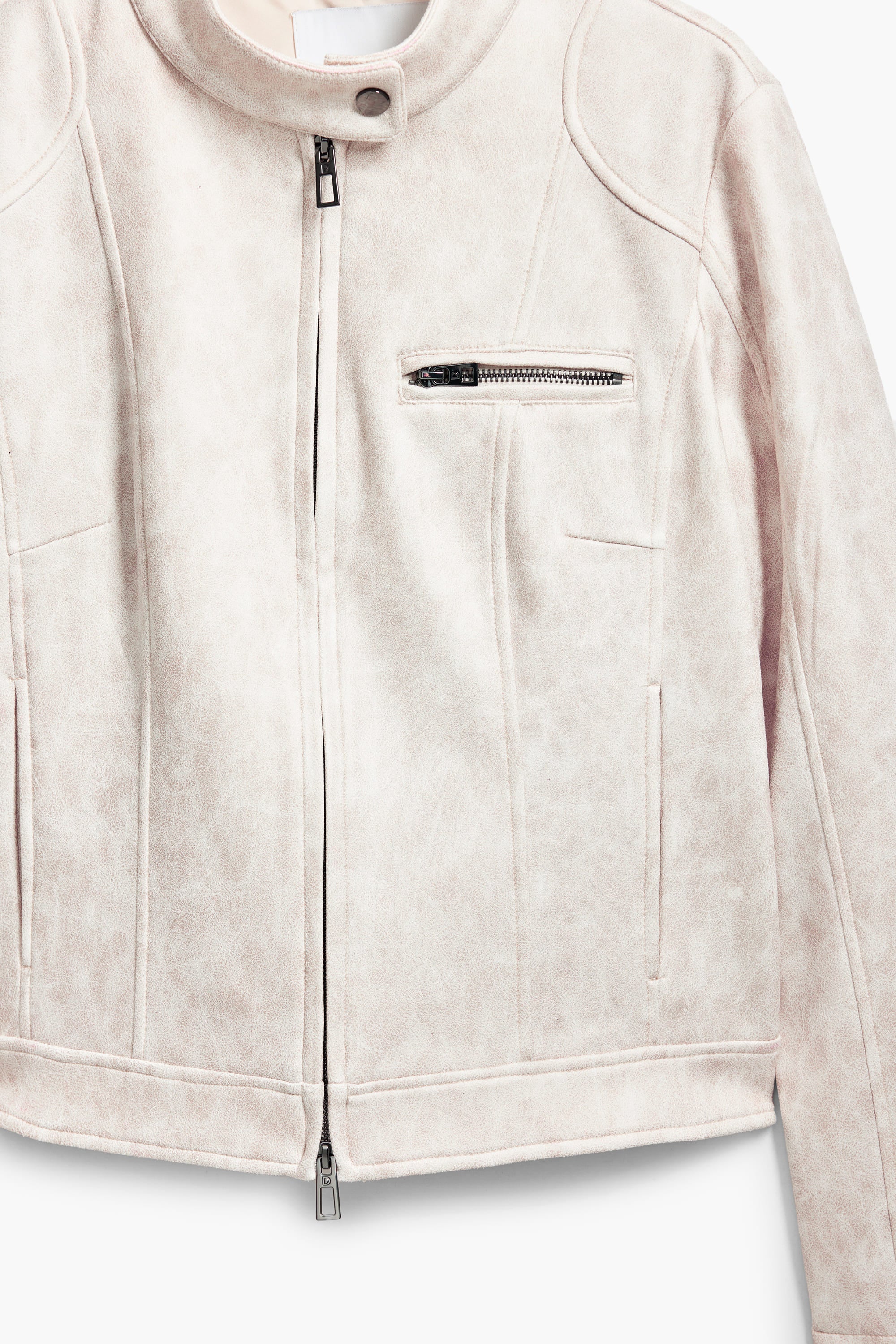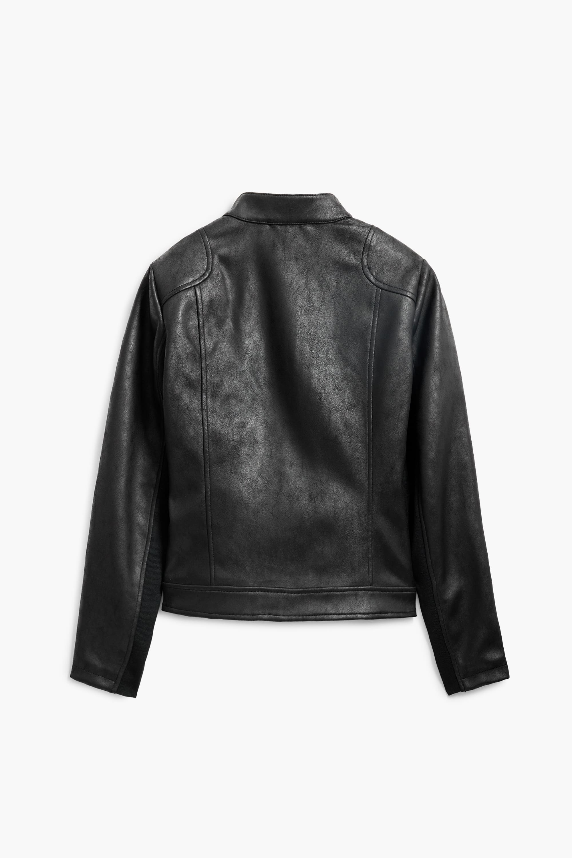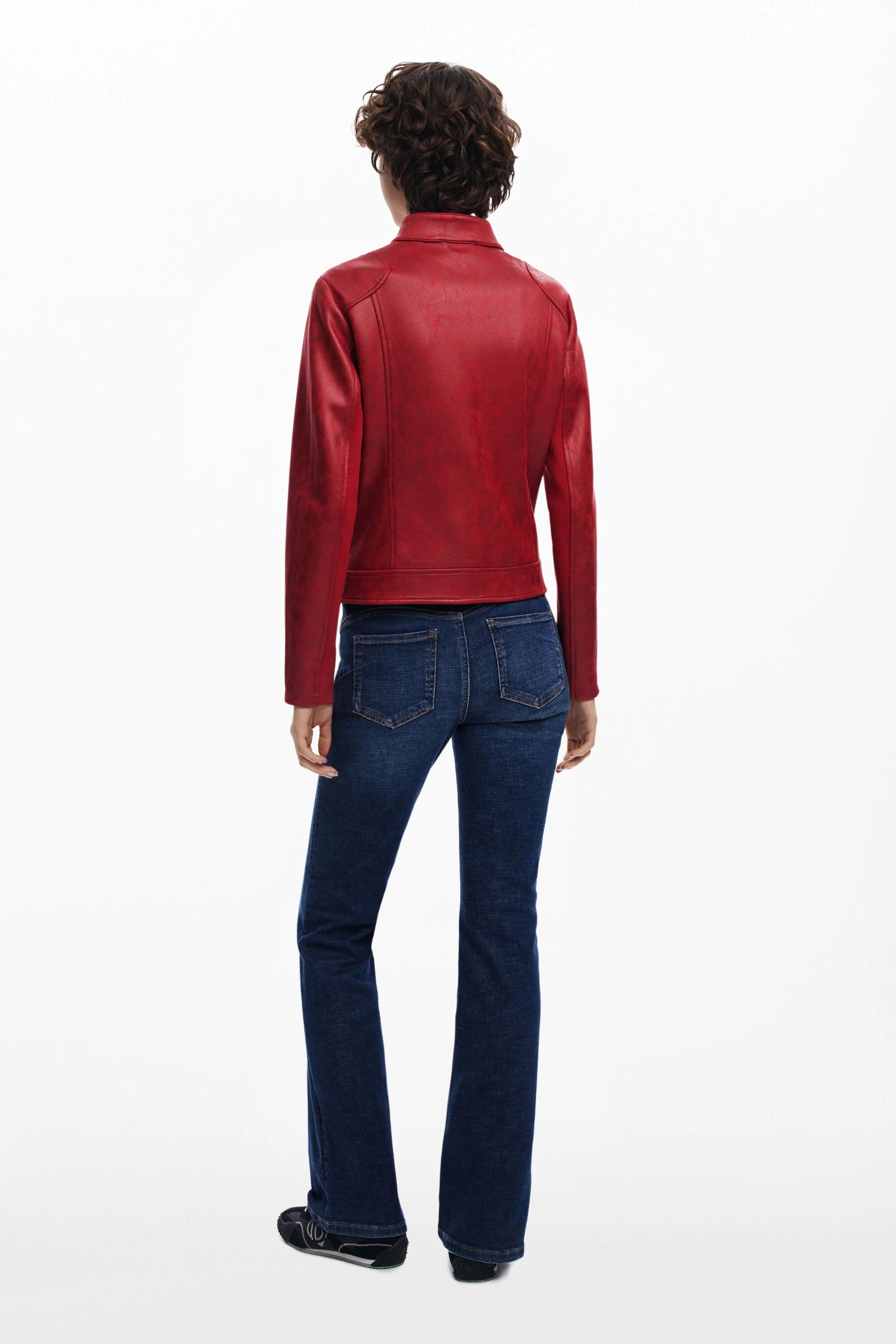 Jacket in worn leather effect, fitted, with mandarin collar, zipper closure, and front pockets.