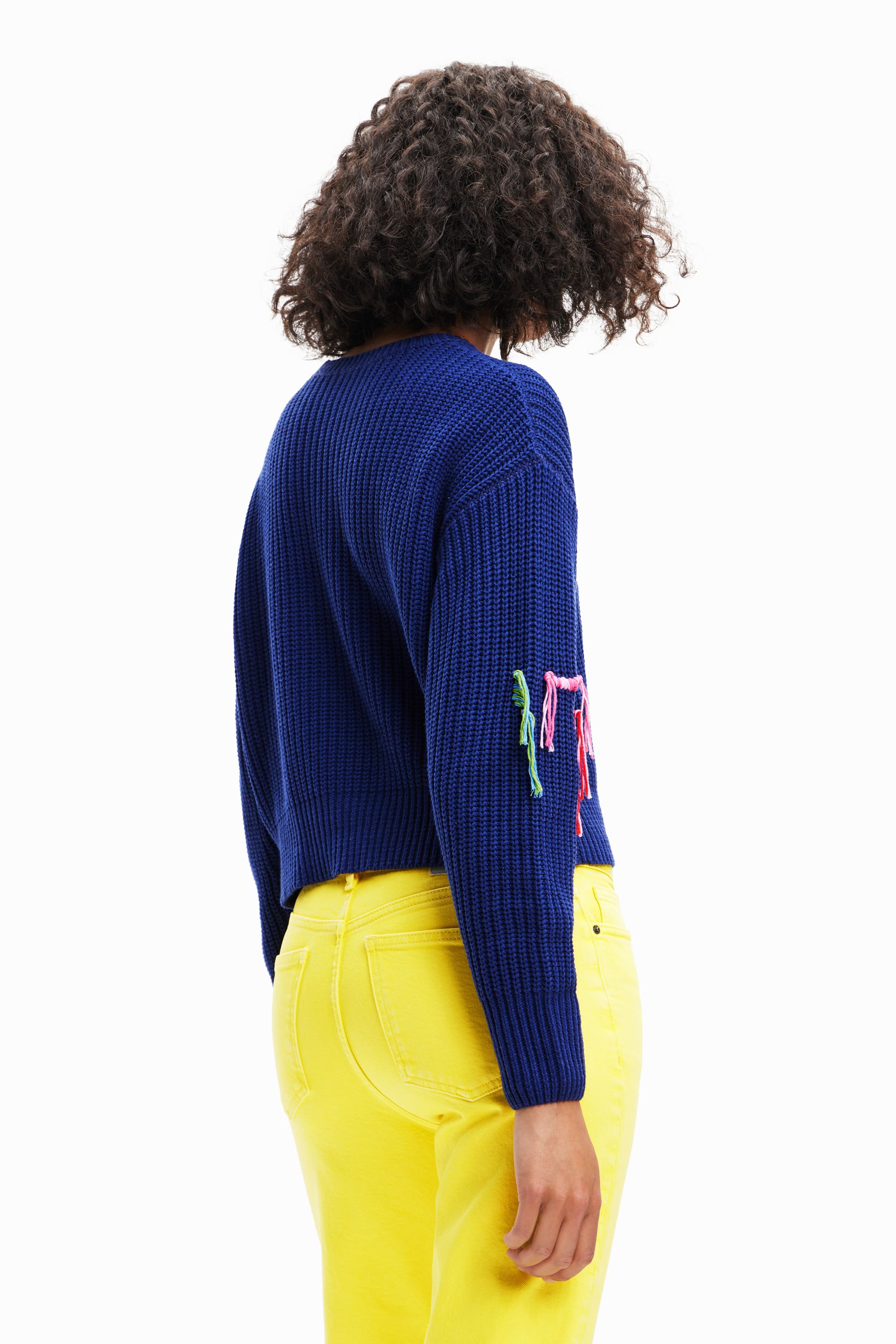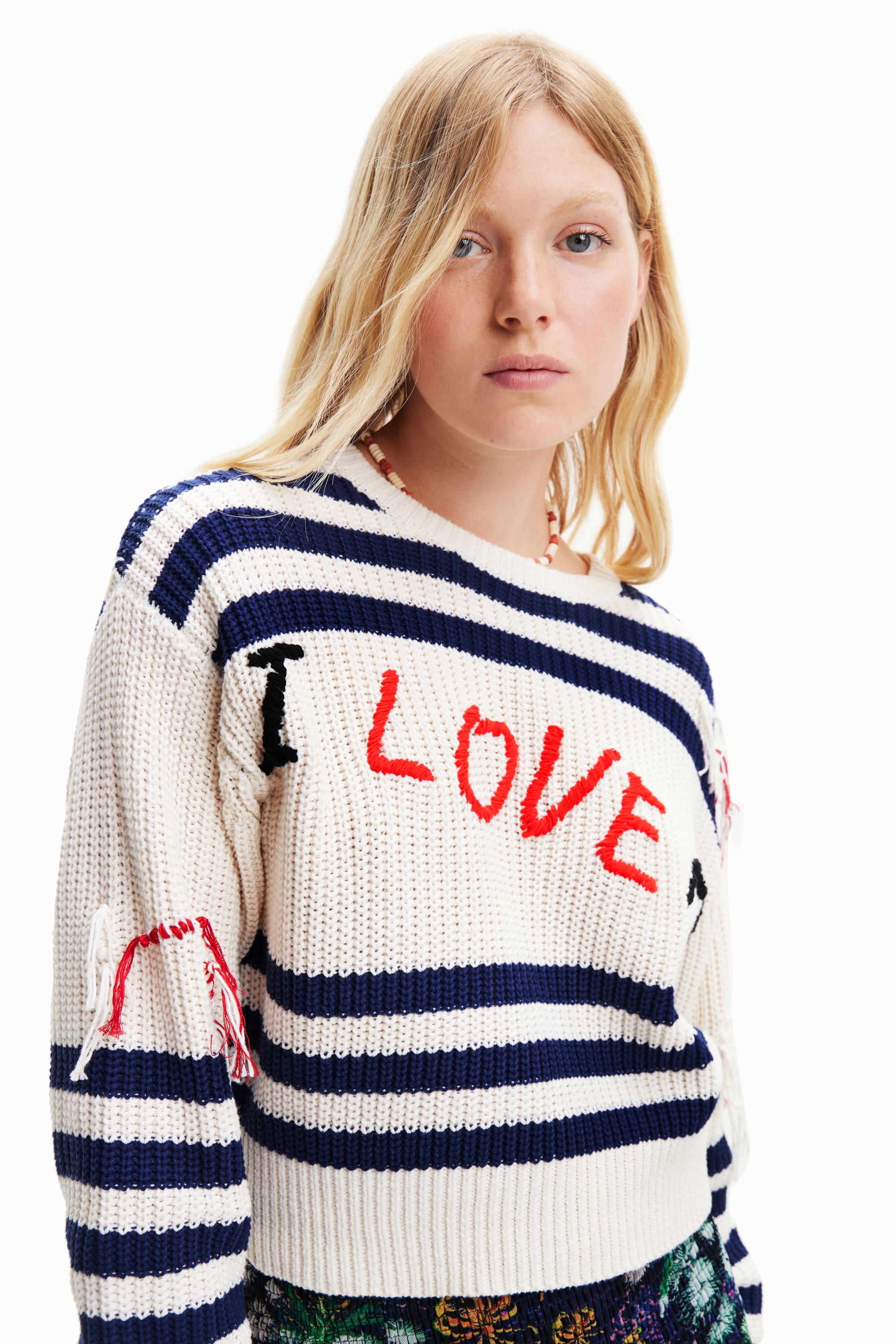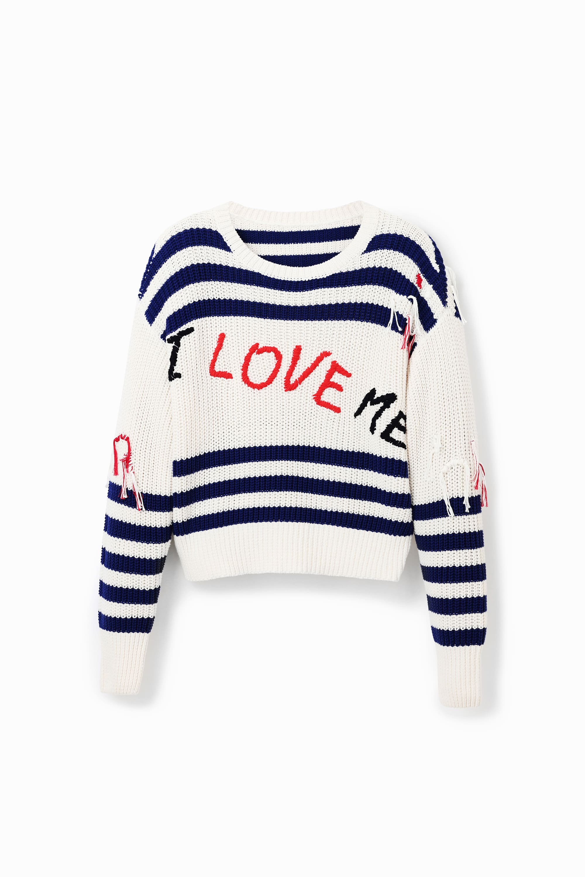Desigual I Love Me Chunky Slouchy Sweater 23SWJF38 A long-sleeve pullover in medium-gauge knit with an embroidered message on the front.
