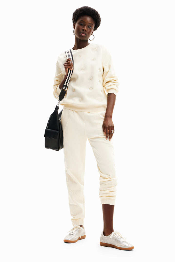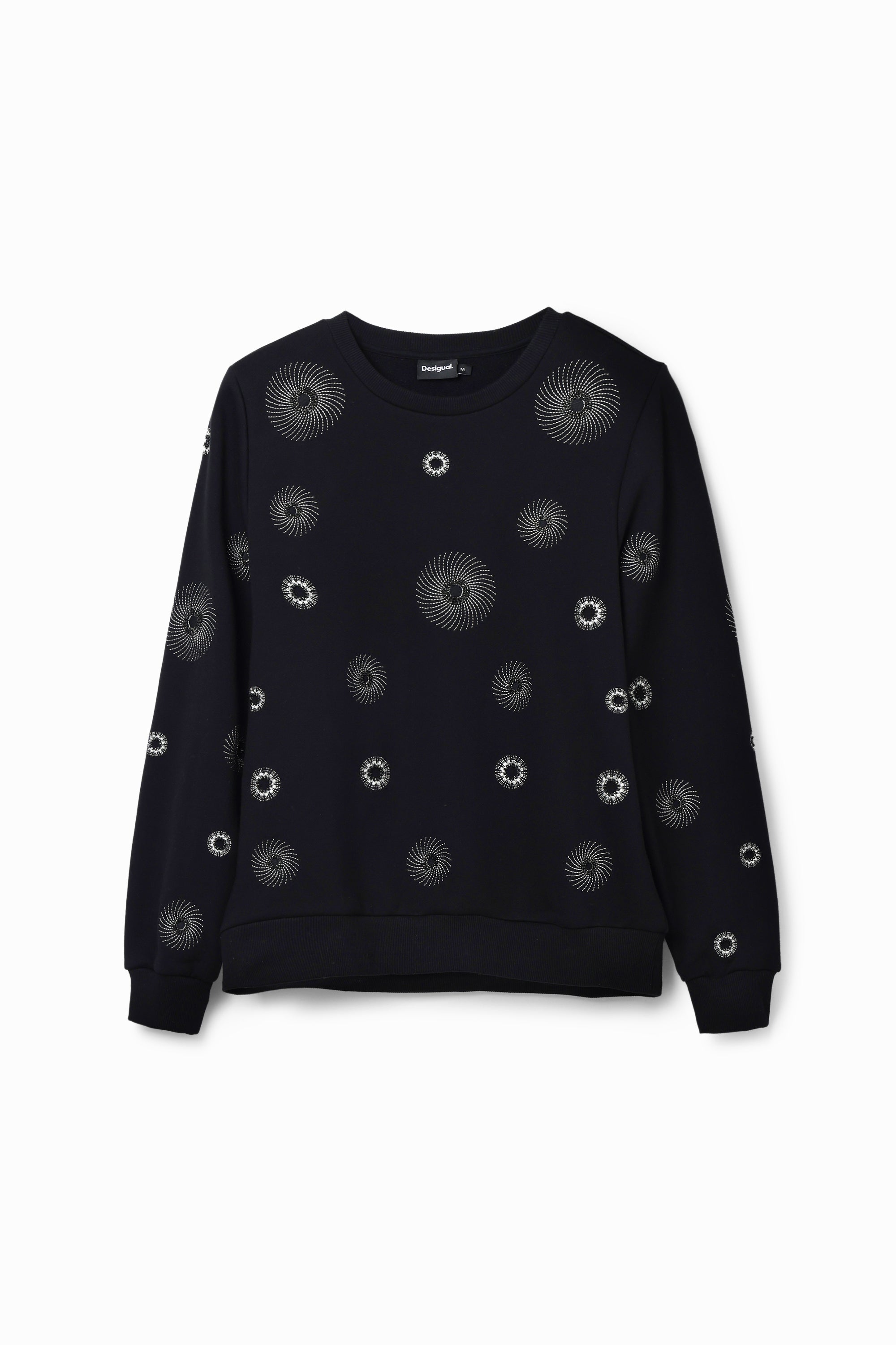 Desigual Joyta Sweater 24SWSK07 A long-sleeve crewneck sweatshirt with metallic geometric embroidery.