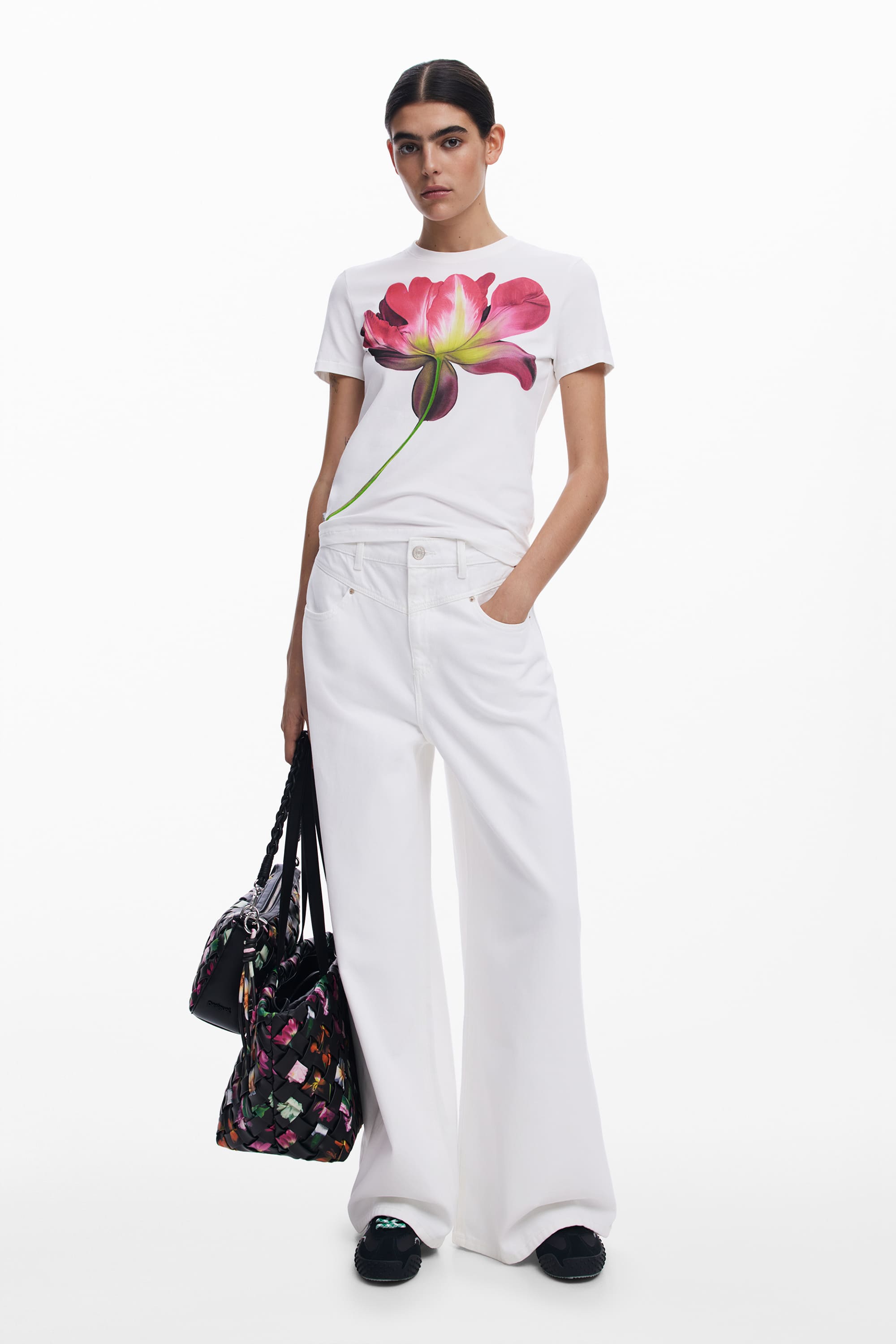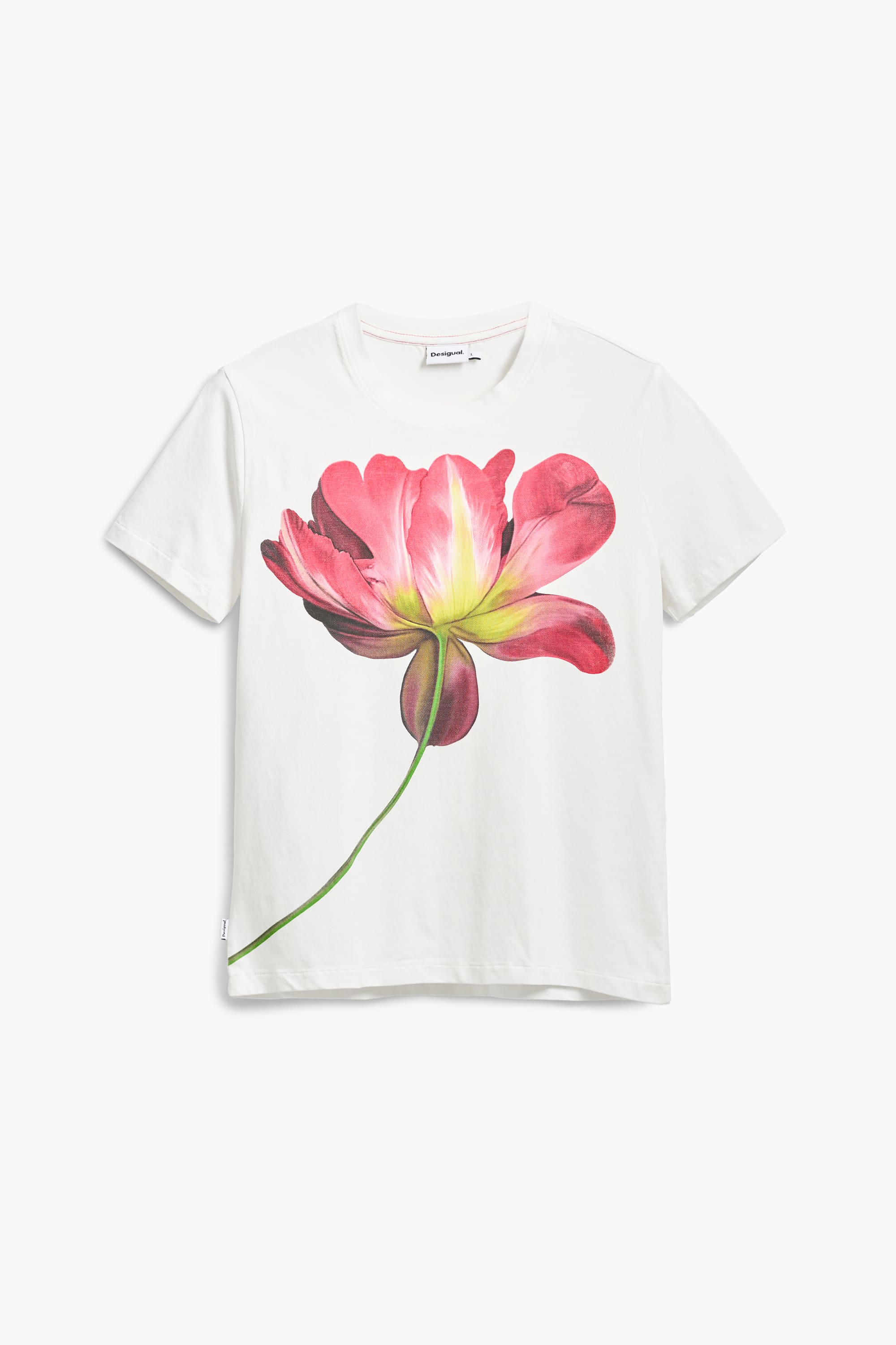 Fitted T-shirt, with a round neck and short sleeves featuring a large flower print on the front.