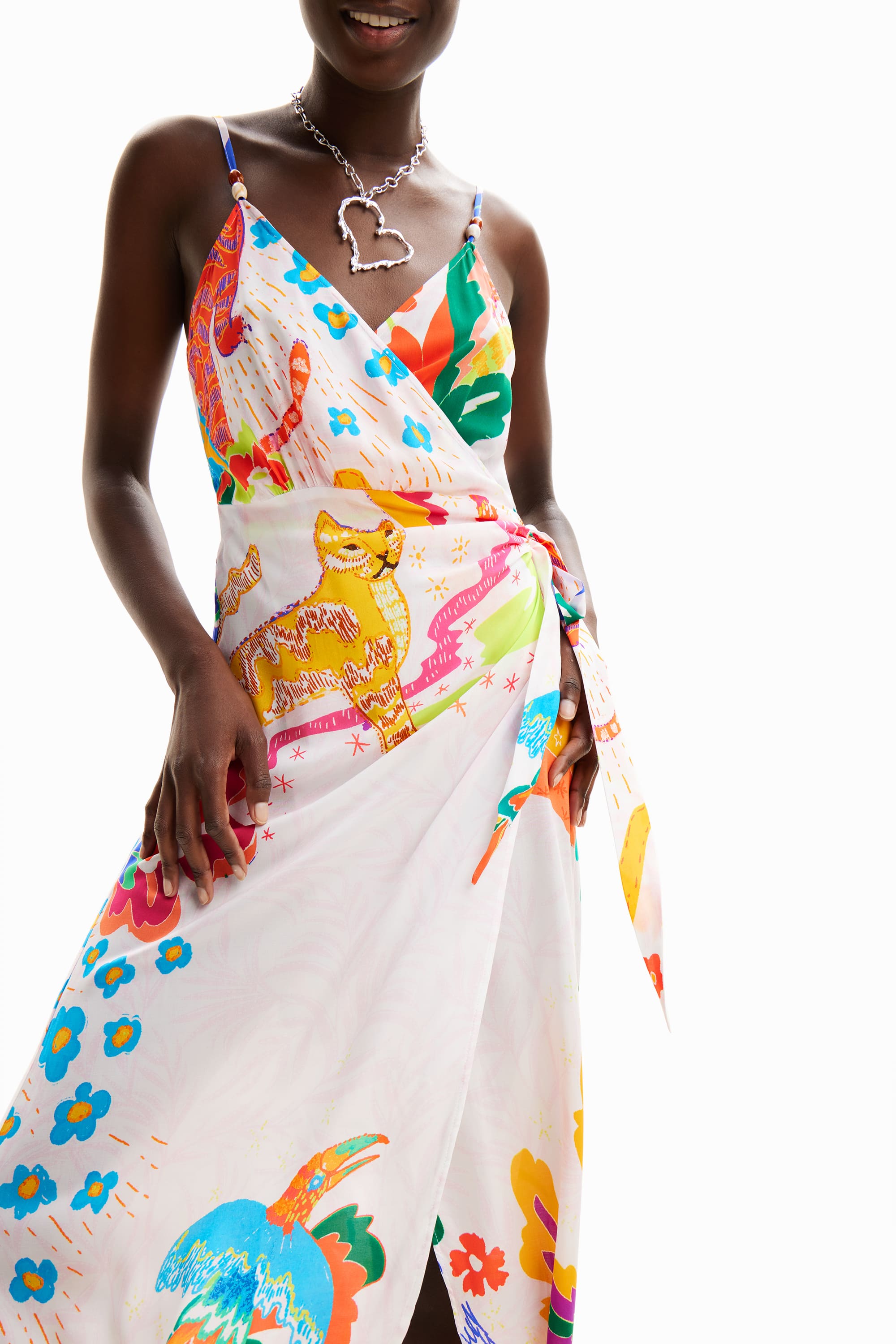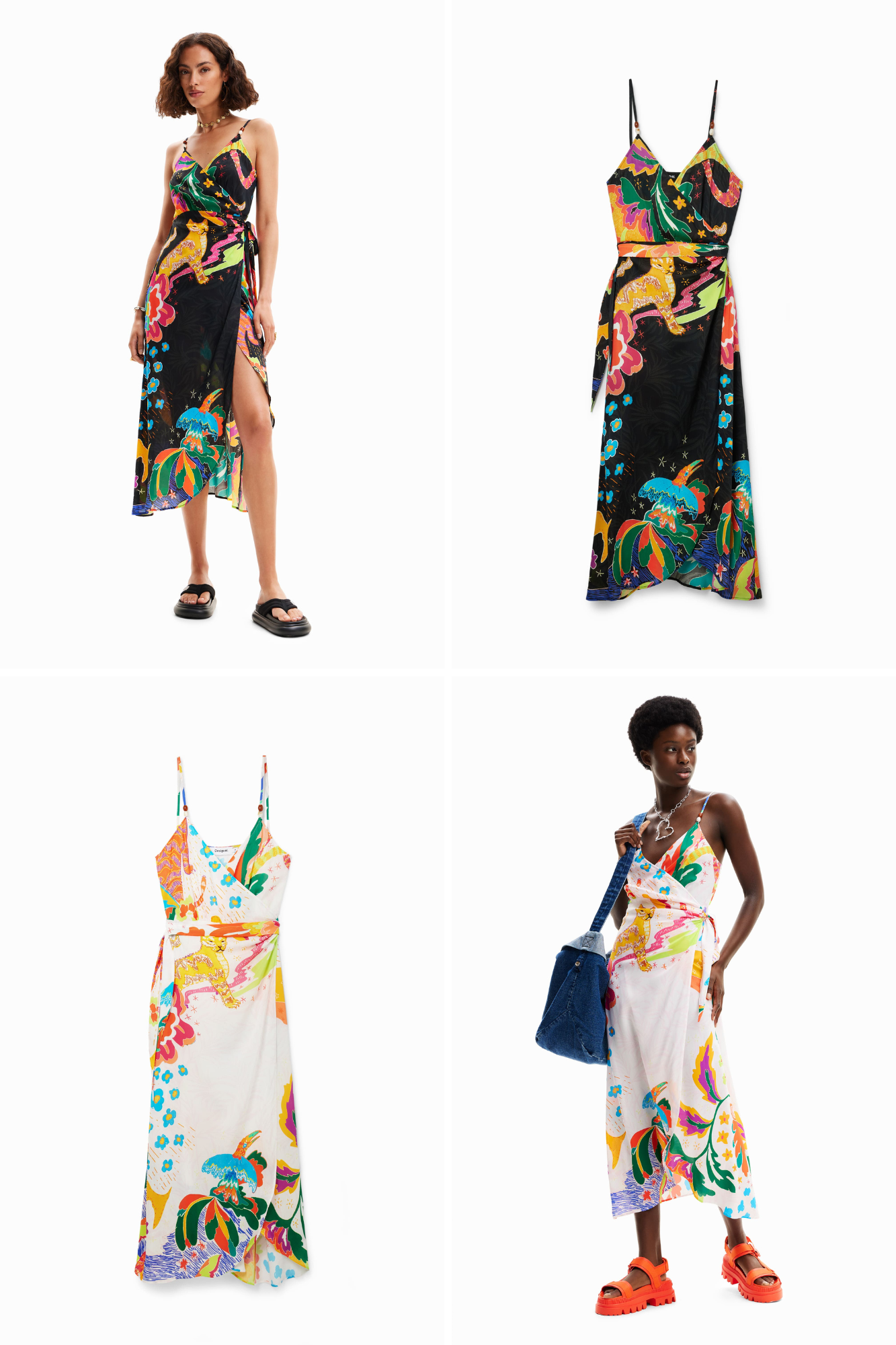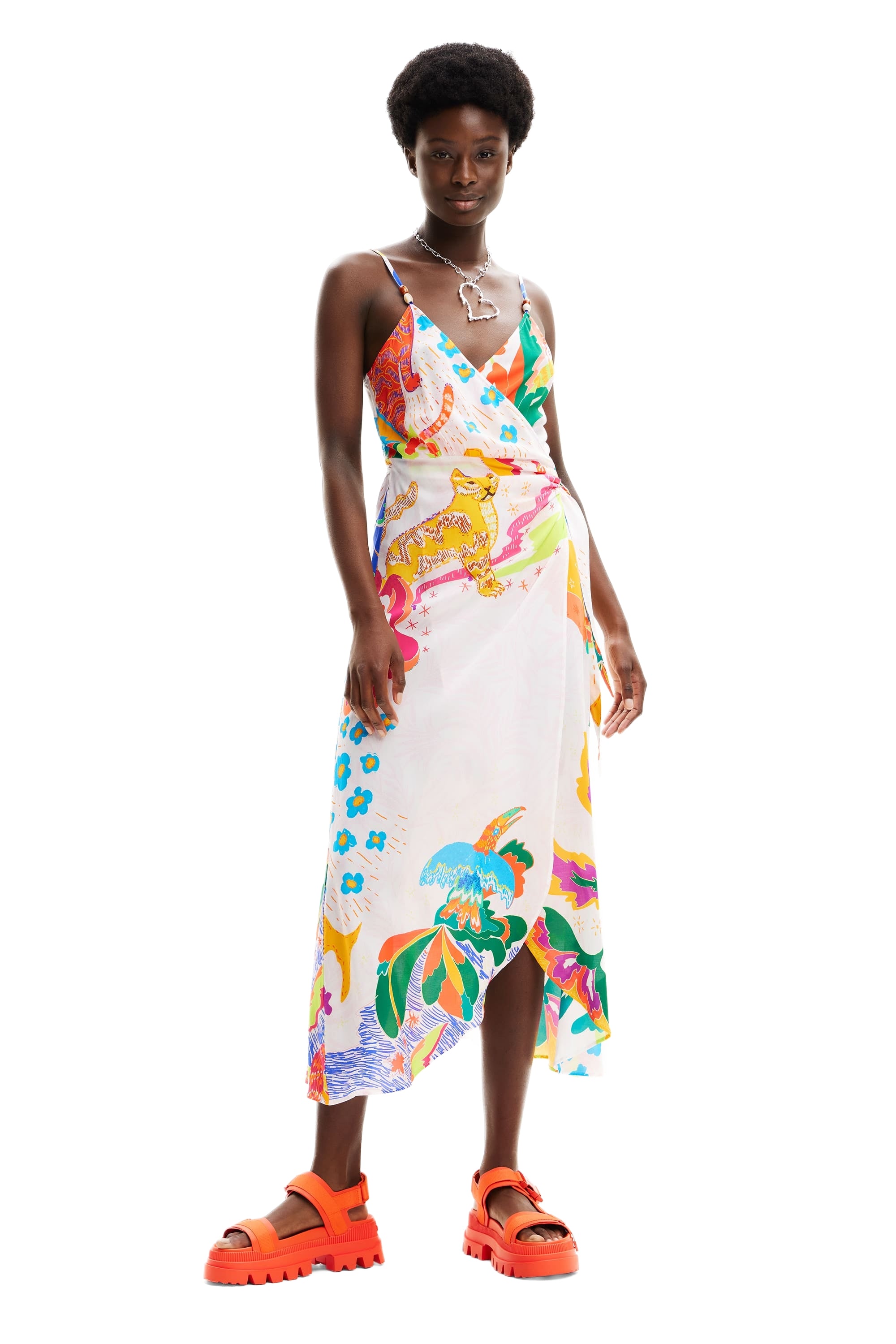 Desigual Selva Beach Midi Dress 24SWMW09 A strappy wrap midi dress with ties at the waist in lightweight viscose fabric with a multicolour print.