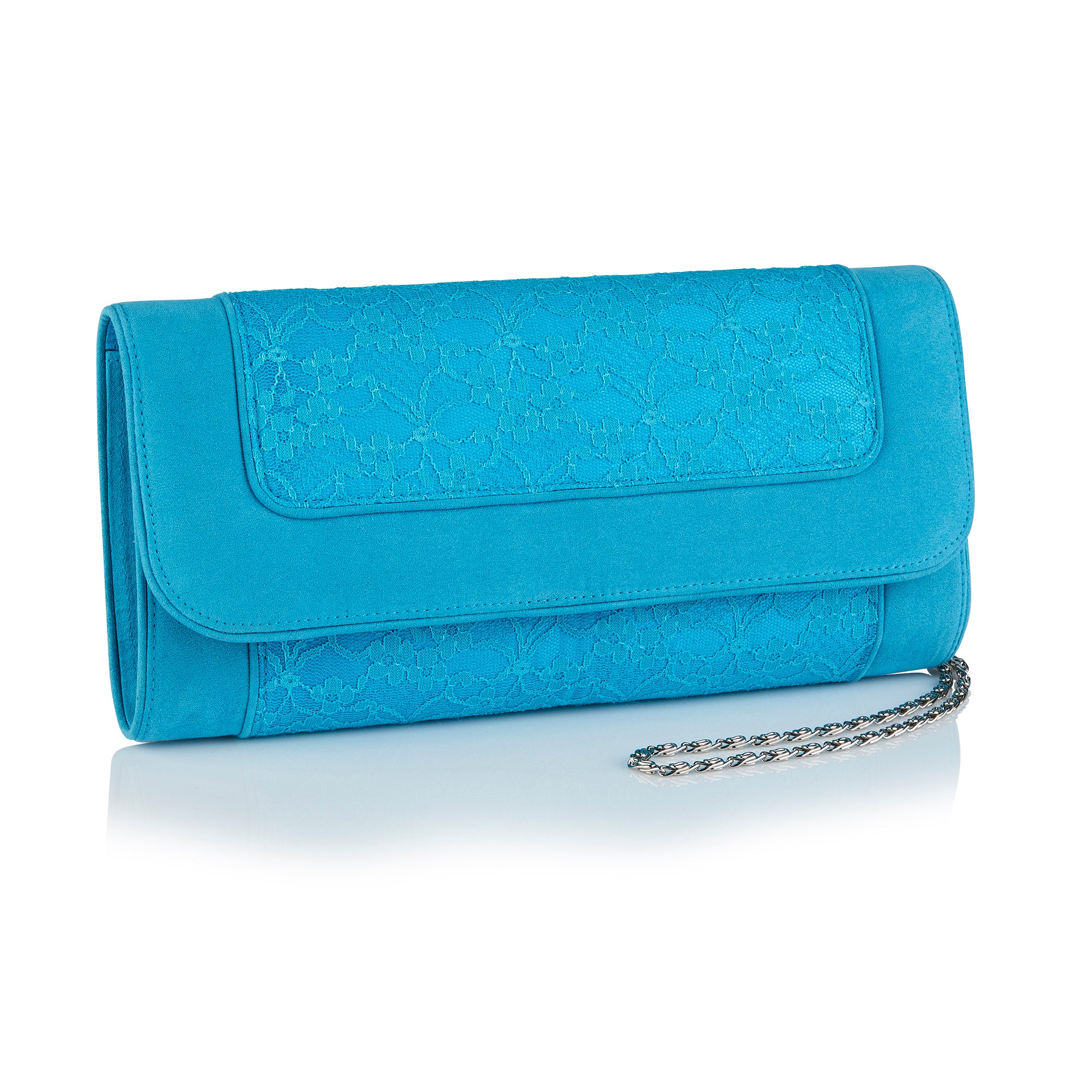 In matching shades of satin, lace and faux suede, the TIRANA clutch bag oozes elegance. With its detachable chain strap, magnetic closure and signature logo badge on the inner pocket. Fastens with a magnetic closure on the front flap and has an inner pocket with Ruby Shoo logo trim and a detachable shoulder strap. Outer: Textile Lining: Textile Width:230mm Height:110mm Depth:50mm Strap length:620mm.