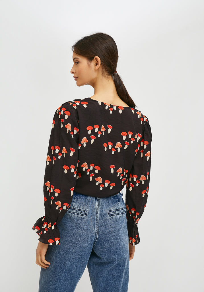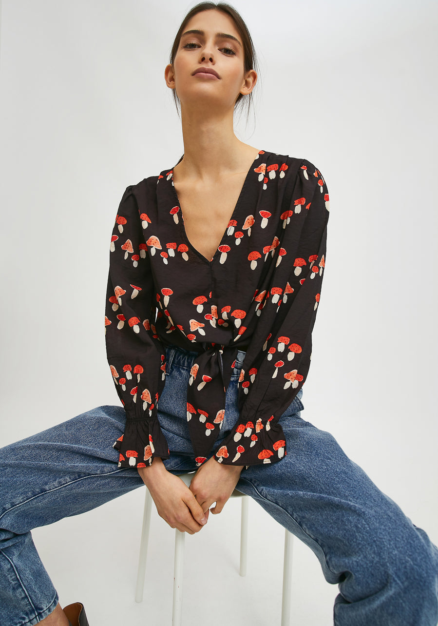 COMP-FA21HAN08 Crop top in fluid fabric withtie front and mushroom print by Compania Fantastica
