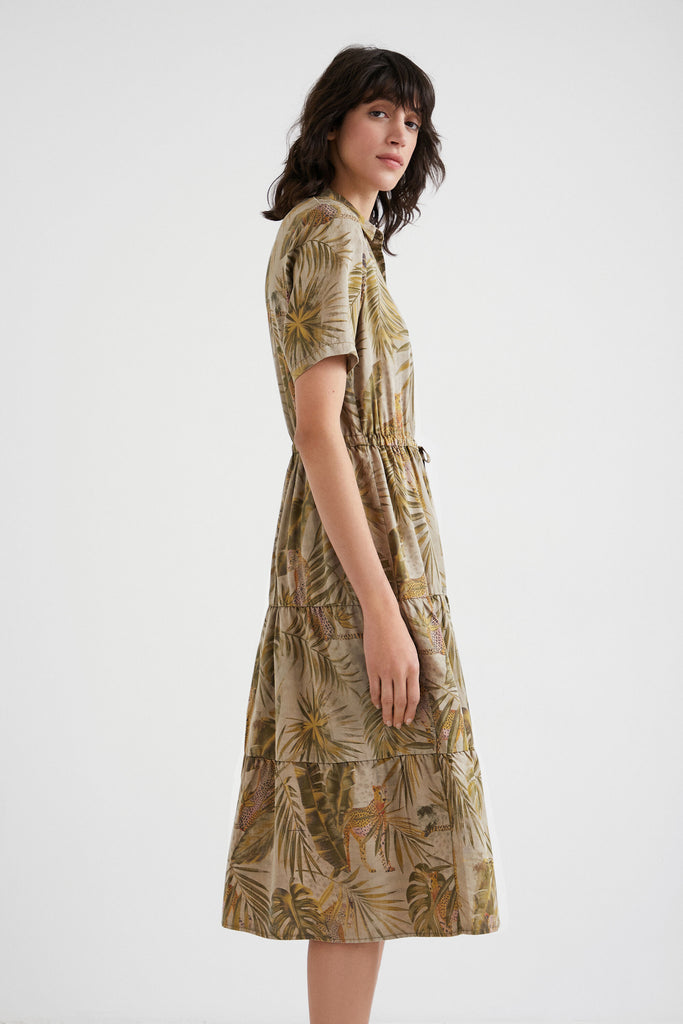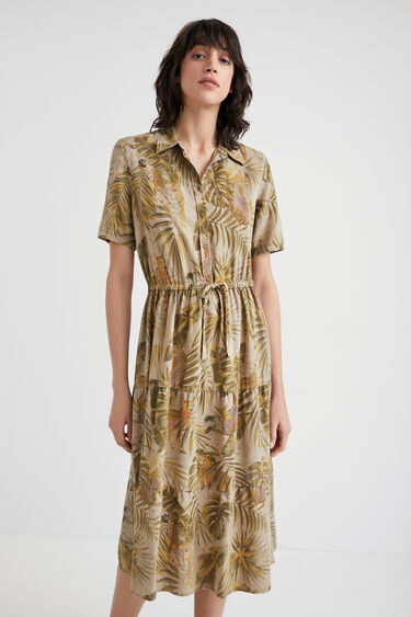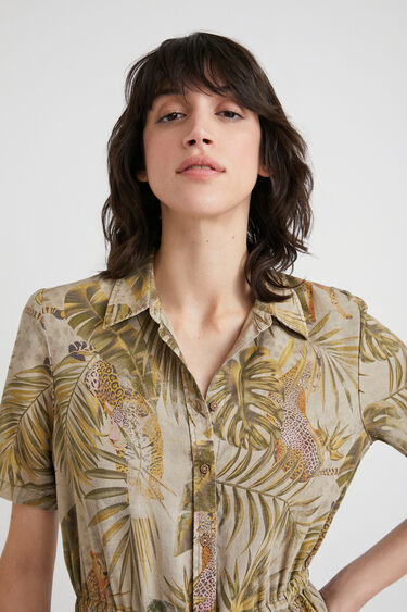 The print of tropical leaves and flowers of this long shirt dress feminizes your safari side in an eco-friendly Tencel fabric that's pleasant to the touch. With belt of the same cloth and pockets. Shirt collar Buttoned from top down Two side pockets and two front pockets on the chest Belt in the same fabric and print. Subtle Tropical floral leaf print Safari style Eco-friendly garment In Tencel, very pleasant to touch Short sleeve