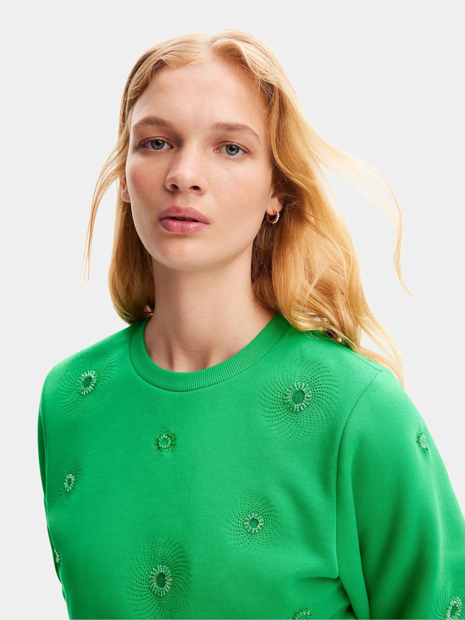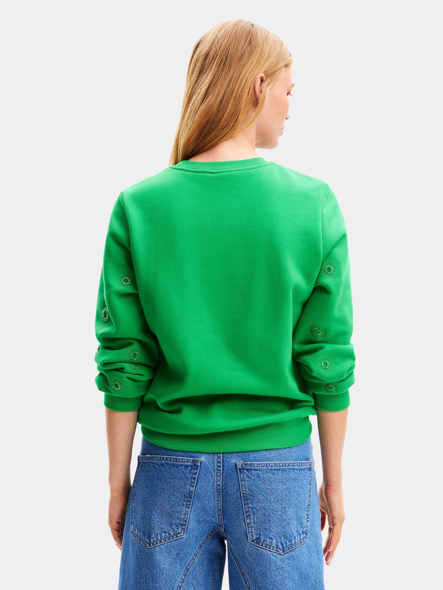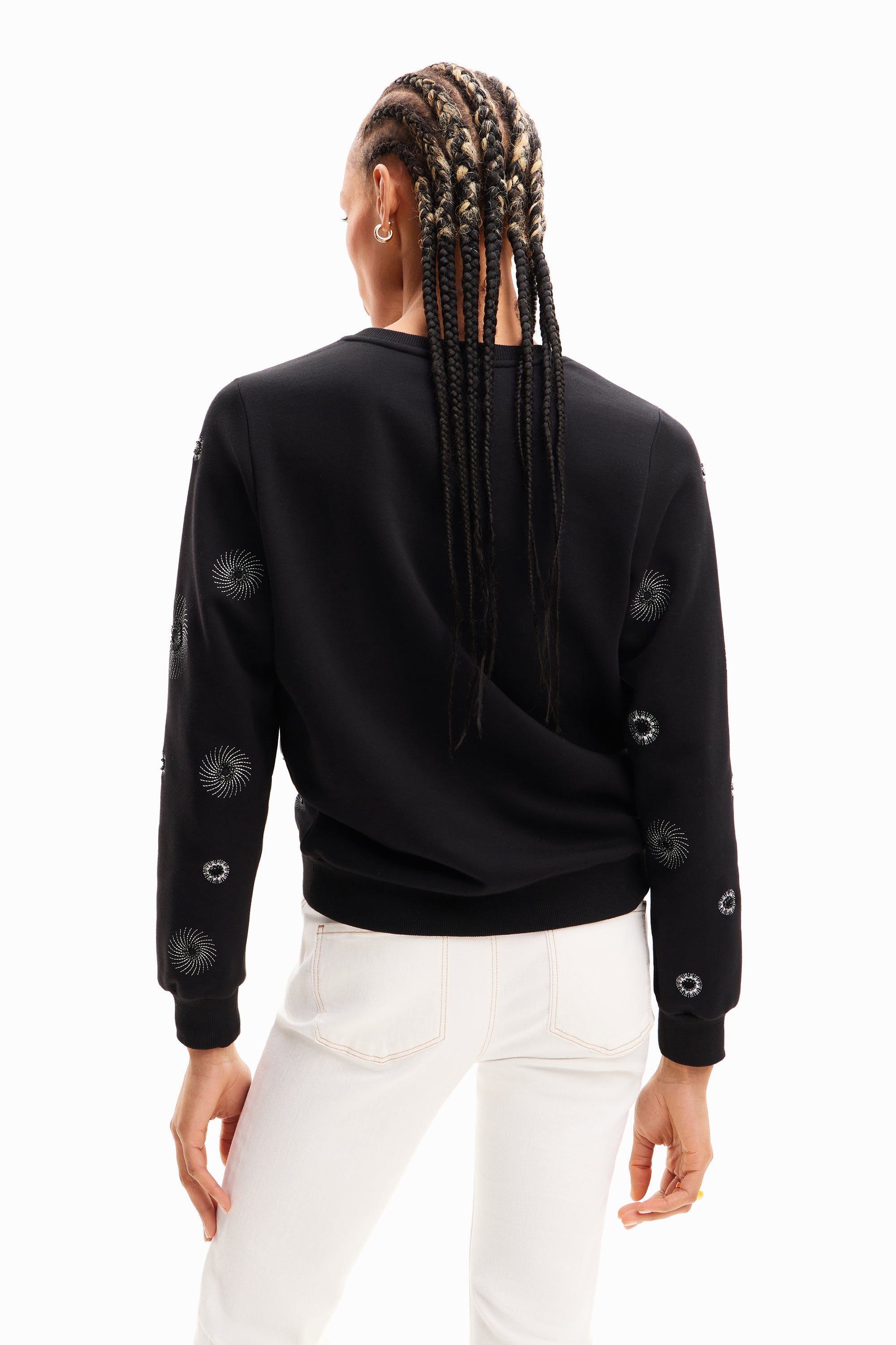 Desigual Joyta Sweater 24SWSK07 A long-sleeve crewneck sweatshirt with metallic geometric embroidery.