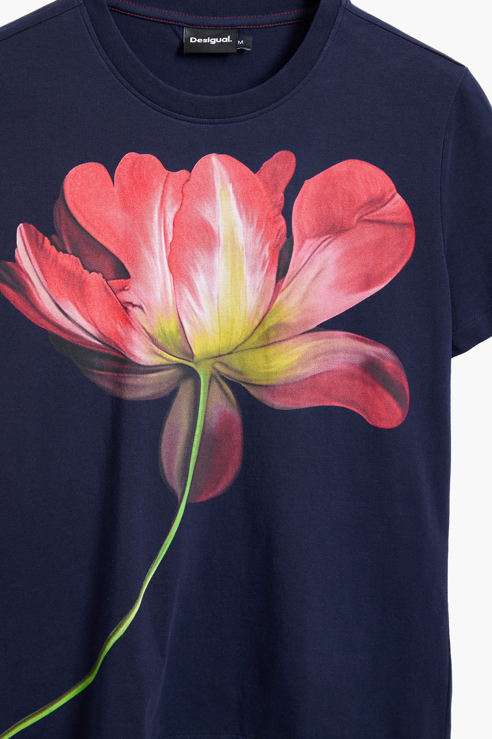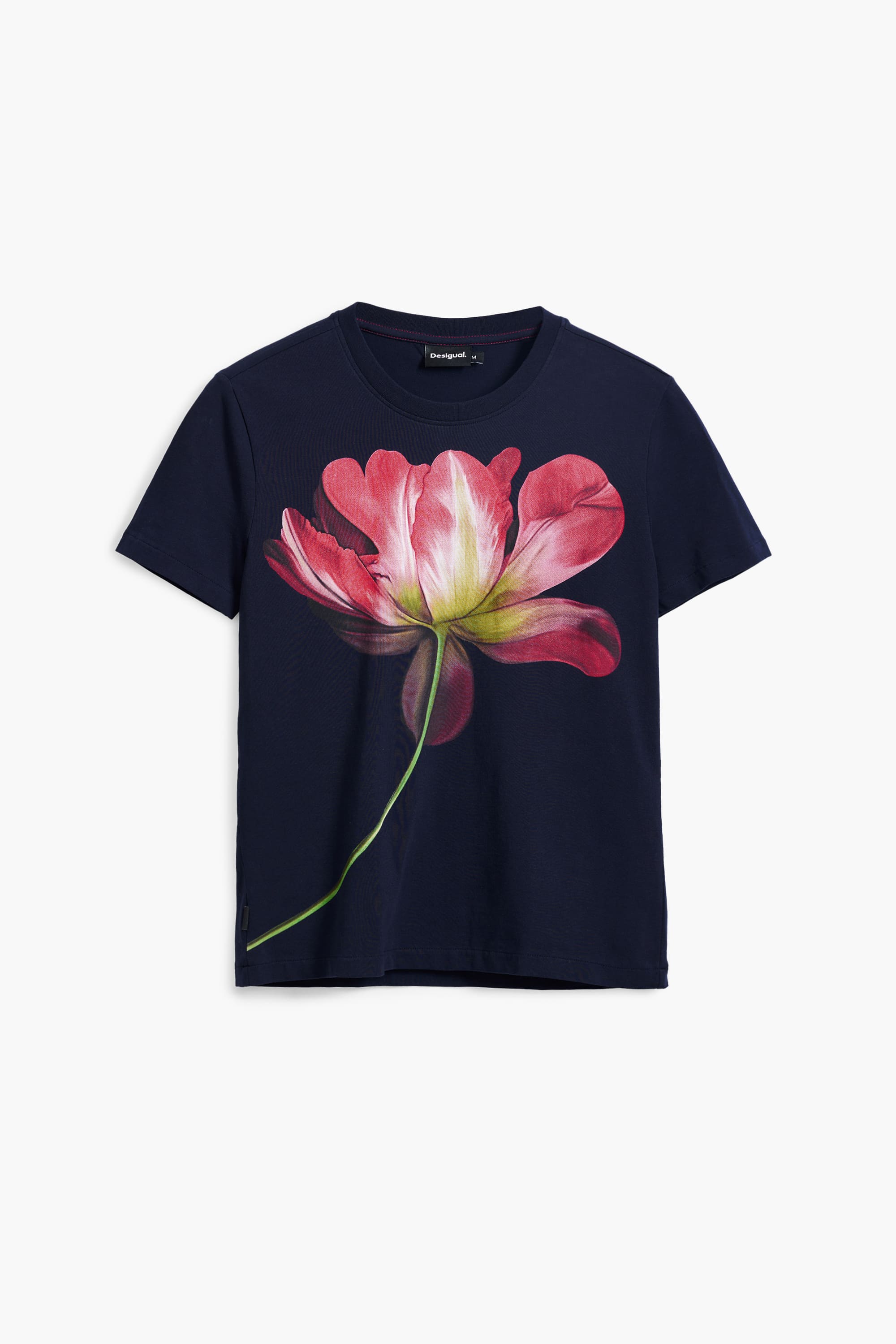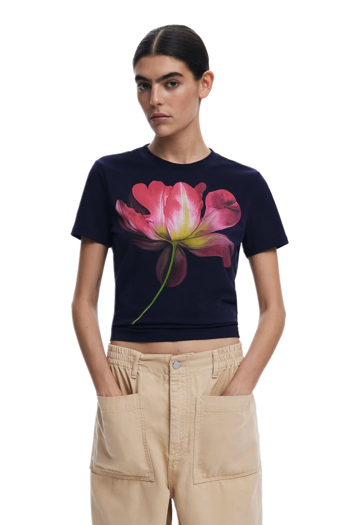 Fitted T-shirt, with a round neck and short sleeves featuring a large flower print on the front.