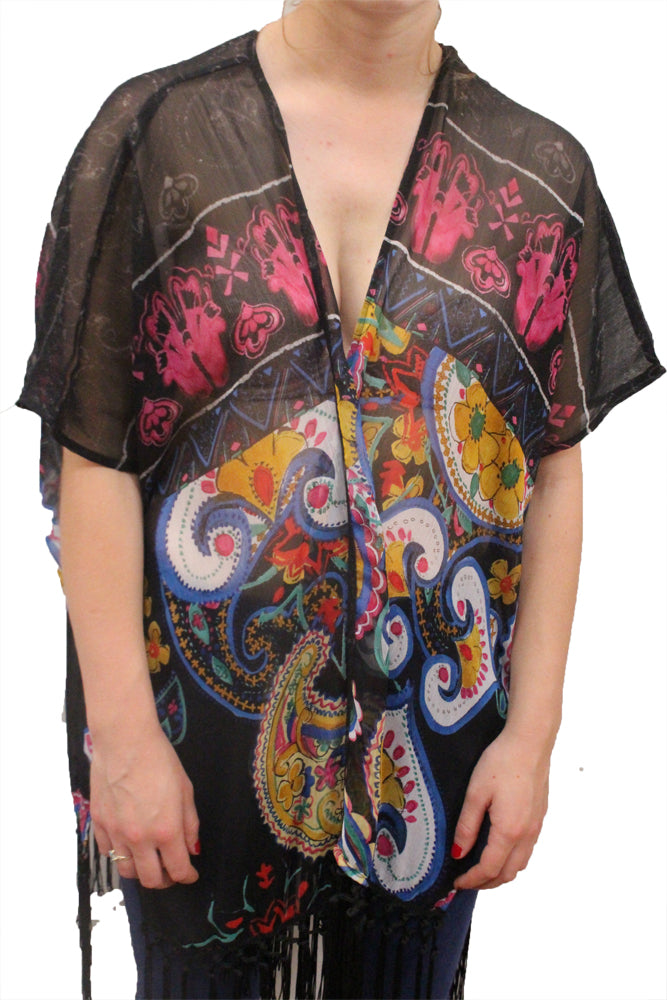 A fabulous versatile top with a swirly floral print on either white or black background. Can be worn over beachwear or over jeans and a vest top. Fringing to the hem gives a boho edge.