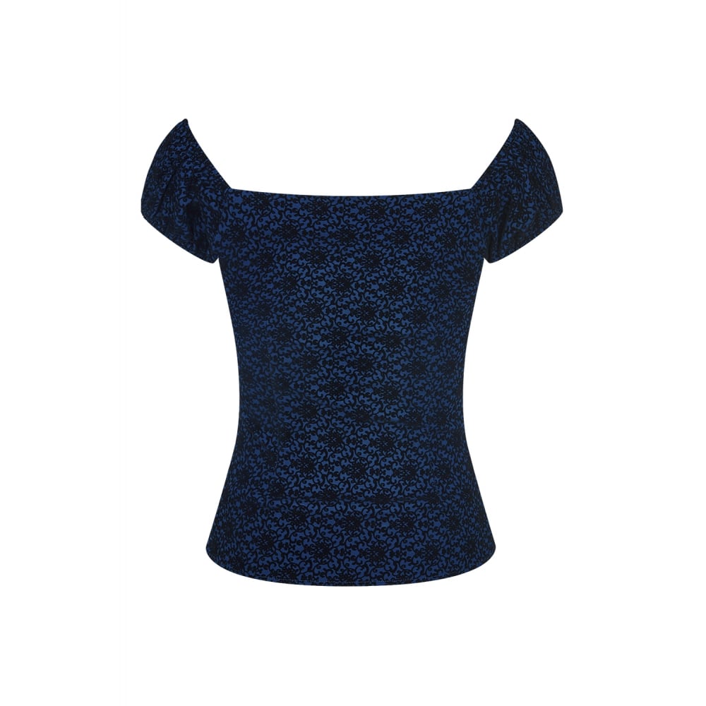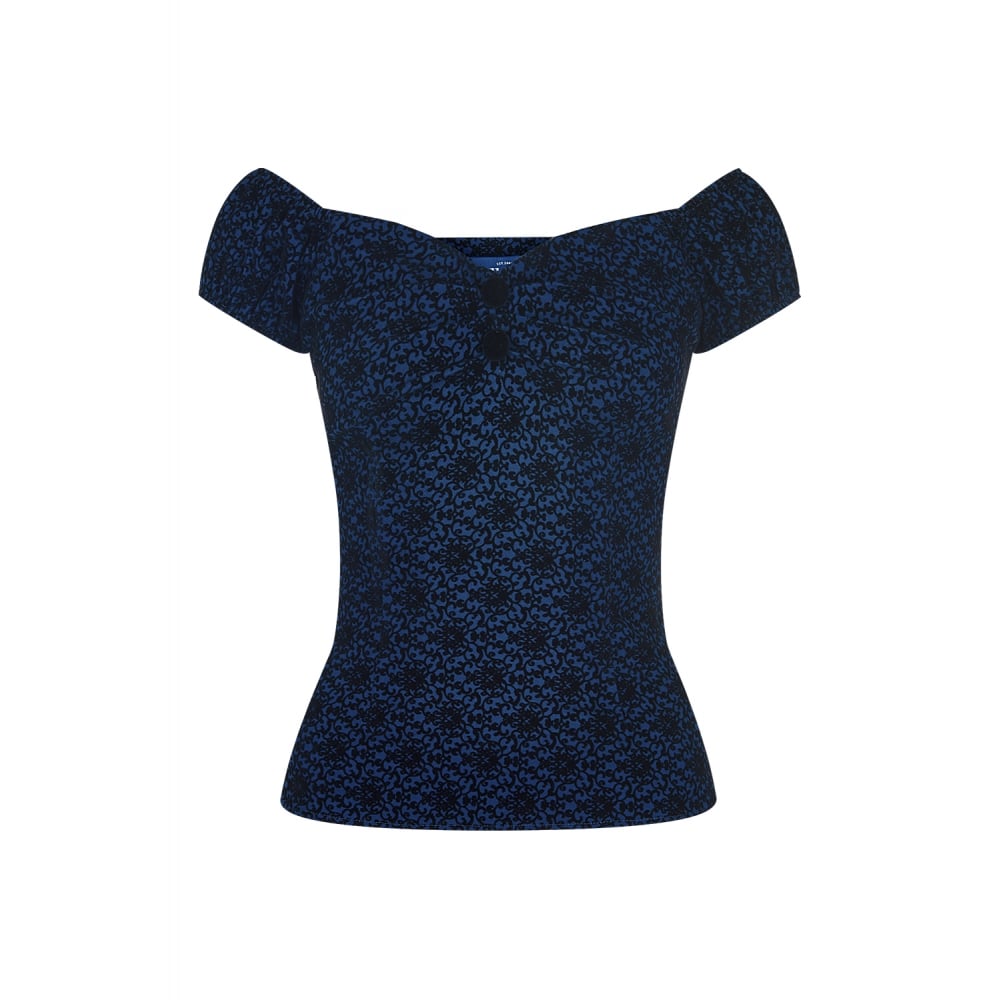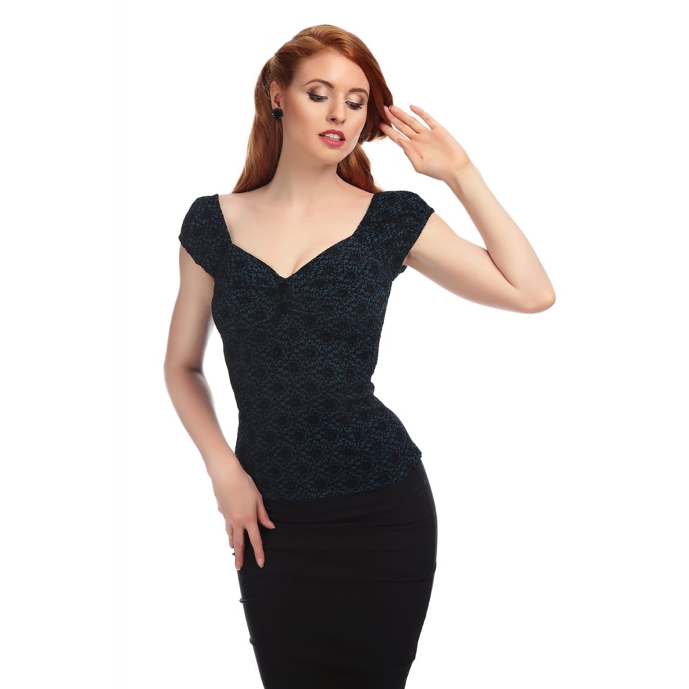 Our classic Dolores top has had a makeover in flocked brocade. The Dolores is a 1950s style gypsy top, with sweetheart neckline, velvet buttons at the bust, side zip, and elasticated puffed sleeves that can be worn on or off the shoulder. Wear with our Fiona Plain Skirt in Black for a dramatically dark ensemble.