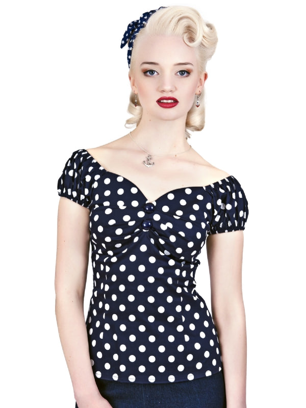 The Dolores Top is a classic Collectif best seller! This vintage 1950s gypsy style top has puff sleeves with a classic sweetheart neckline. It finishes at the hip but is fitted at the waist, so this is a very versatile style. You can wear it with tucked in to a pencil/swing skirt or dressed down with jeans. It is finished off with a couple of buttons at the bust, a must have for all you rockabilly dolls. If you don't have one yet, what are you waiting for?