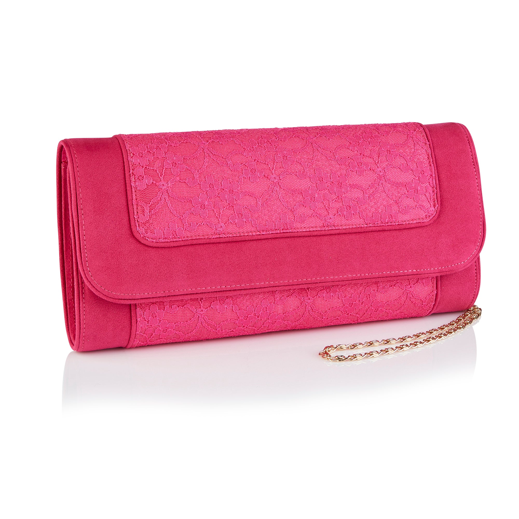 In matching shades of satin, lace and faux suede, the TIRANA clutch bag oozes elegance. With its detachable chain strap, magnetic closure and signature logo badge on the inner pocket. Fastens with a magnetic closure on the front flap and has an inner pocket with Ruby Shoo logo trim and a detachable shoulder strap. Outer: Textile Lining: Textile Width:230mm Height:110mm Depth:50mm Strap length:620mm.